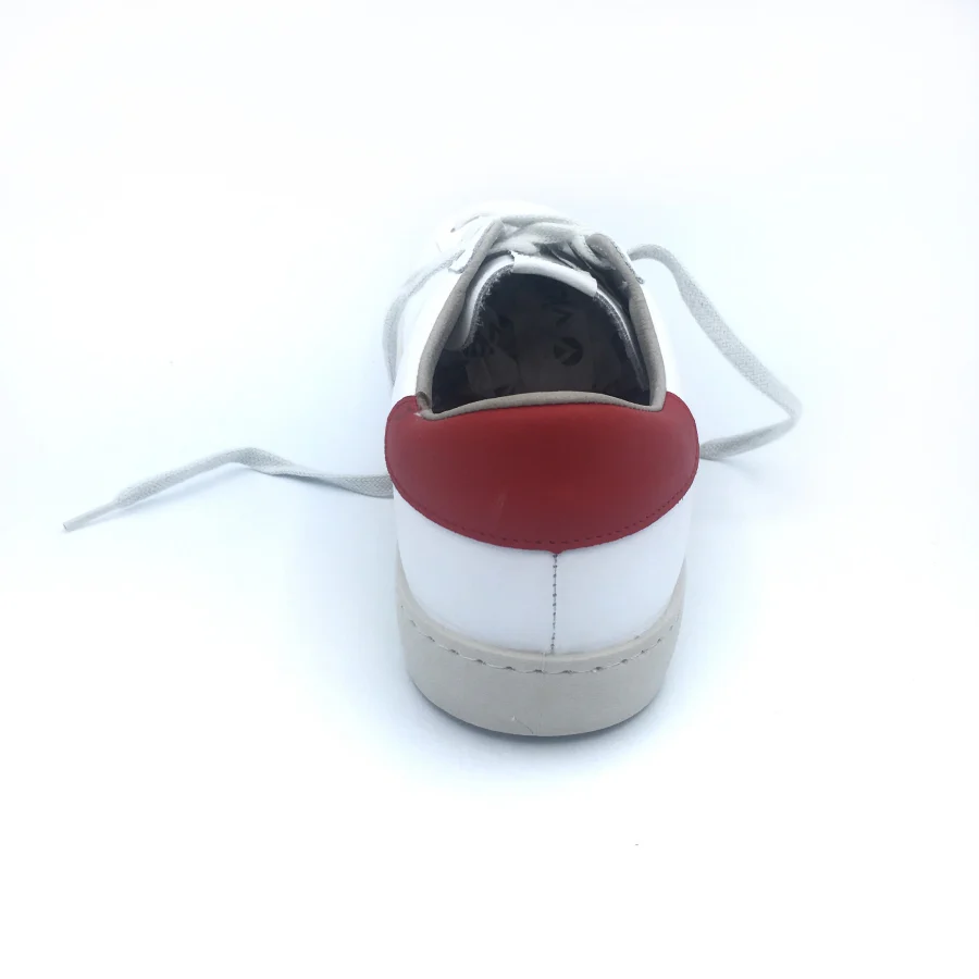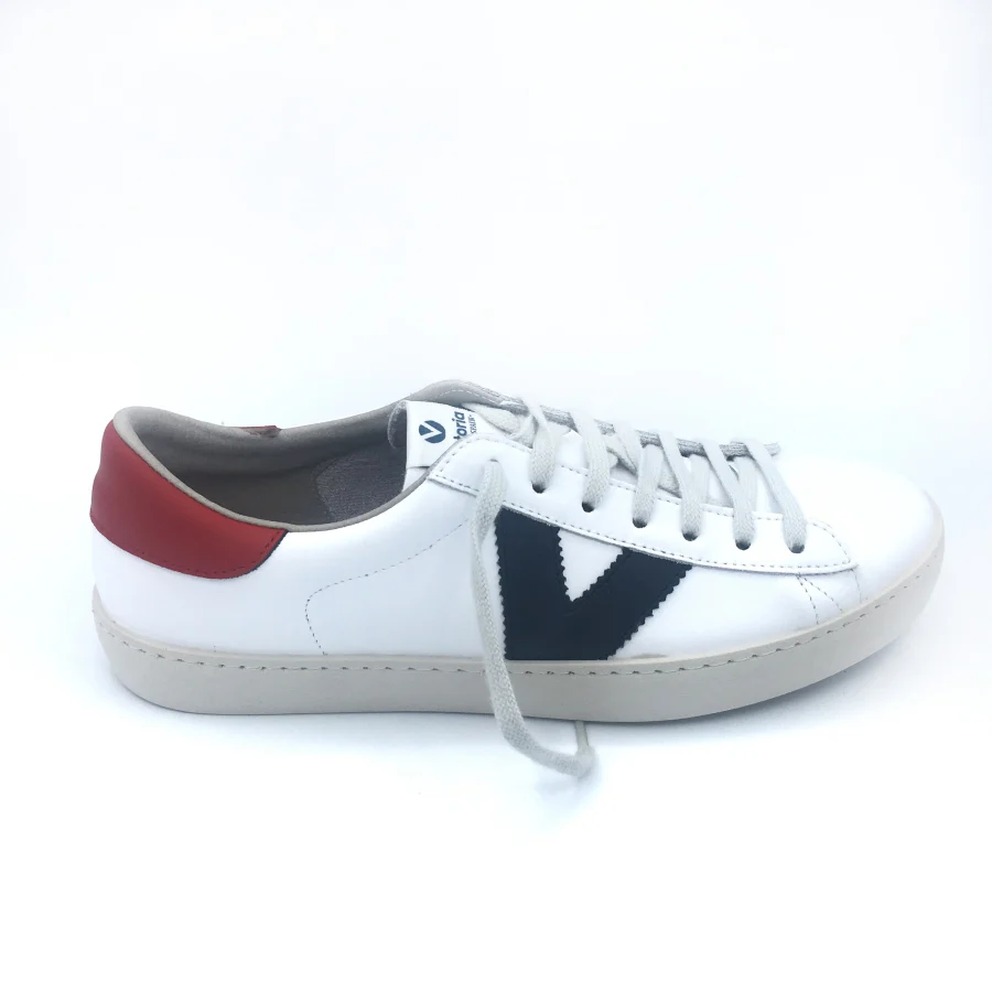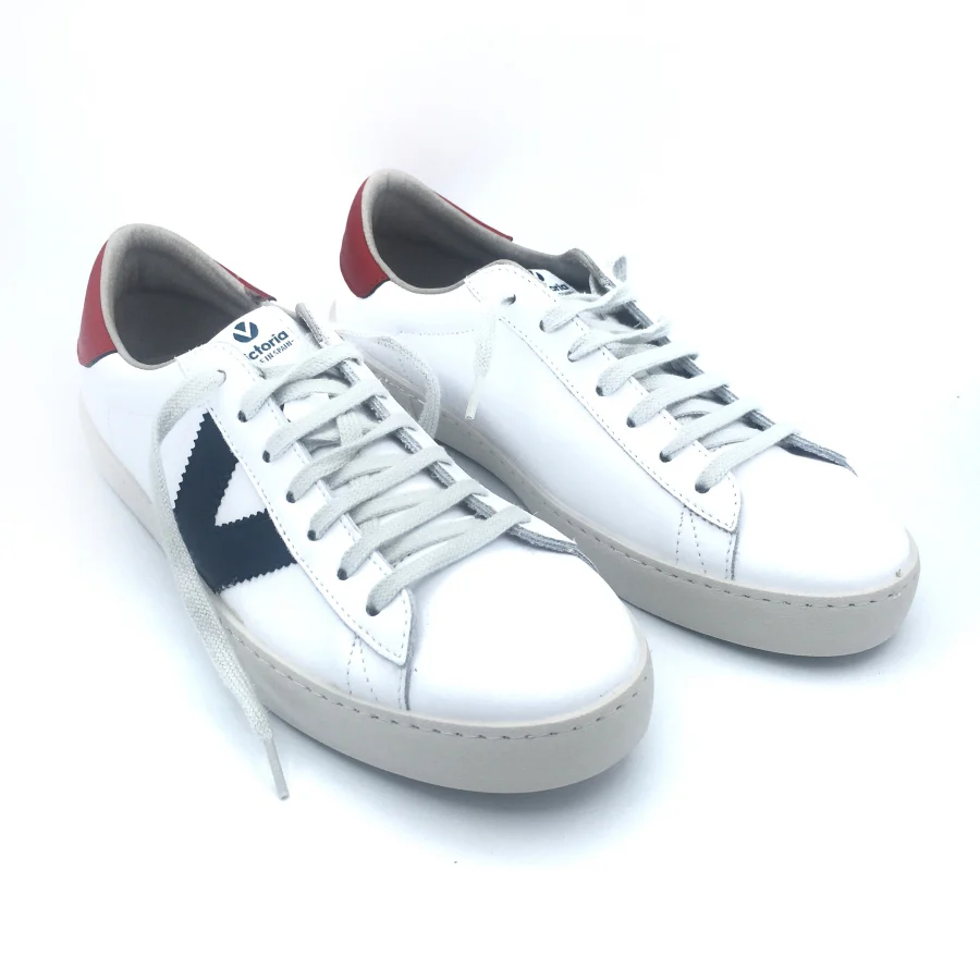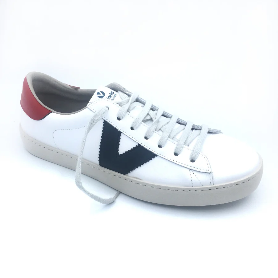 Scarpe sportive da uomo in pelle bianca. Con logo Victoria blu e tacco rosso a contrasto. Sono realizzati in Spagna con una composizione innovativa nelle suole che sostituisce gli oli minerali con i vegetali, rendendoli più biodegradabili.