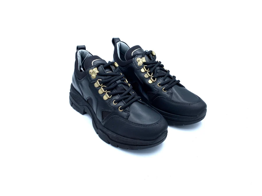 Sneakers NG in pelle e tessuto tecnico arricchito da ganci e passalacci metal, allacciatura da trekking, sottopiede estraibile, fondo gomma altezza 5 cm