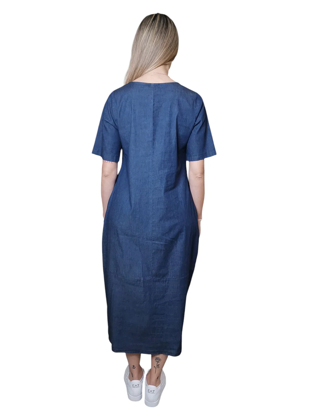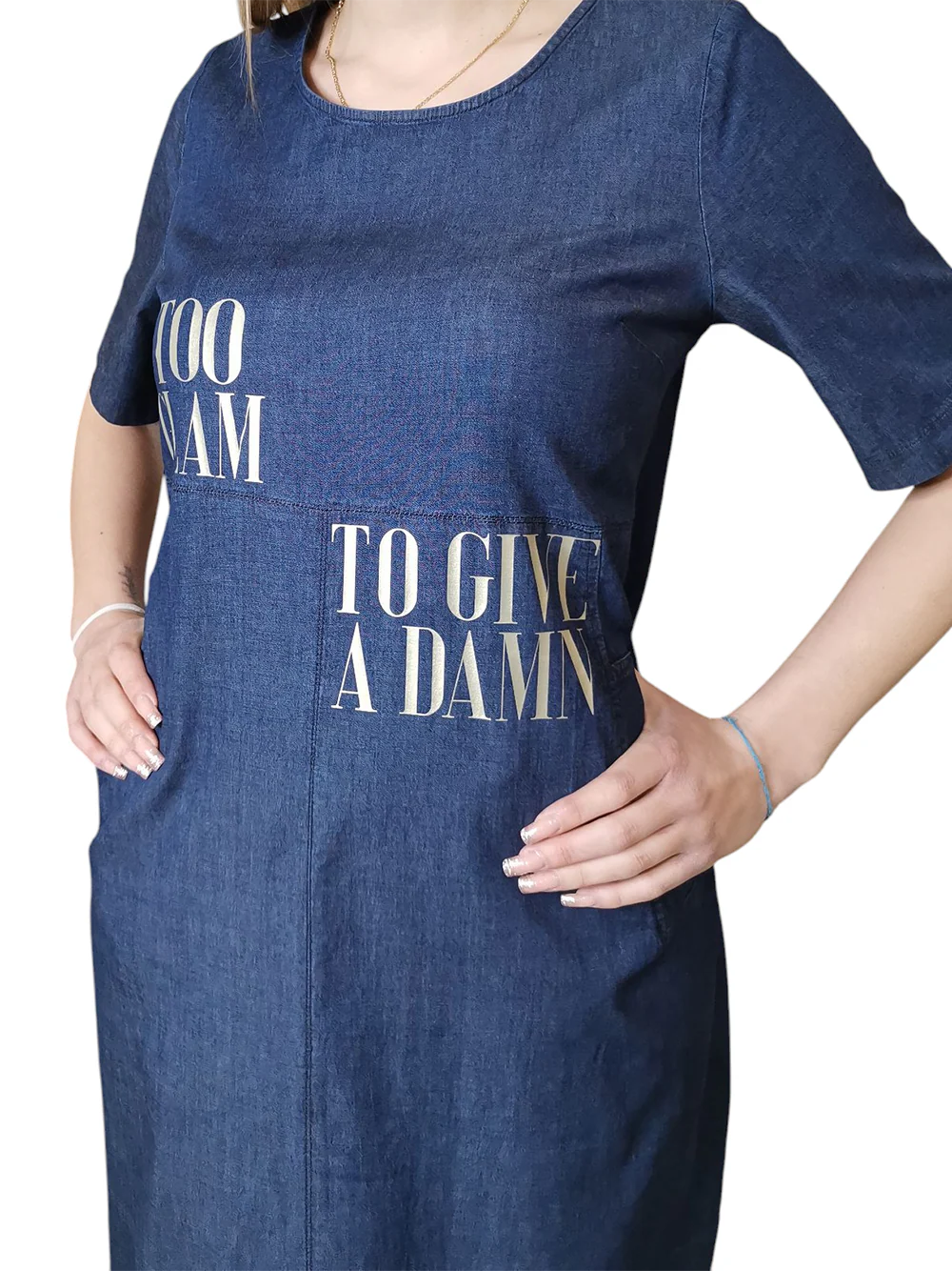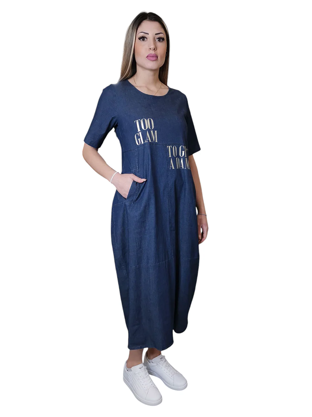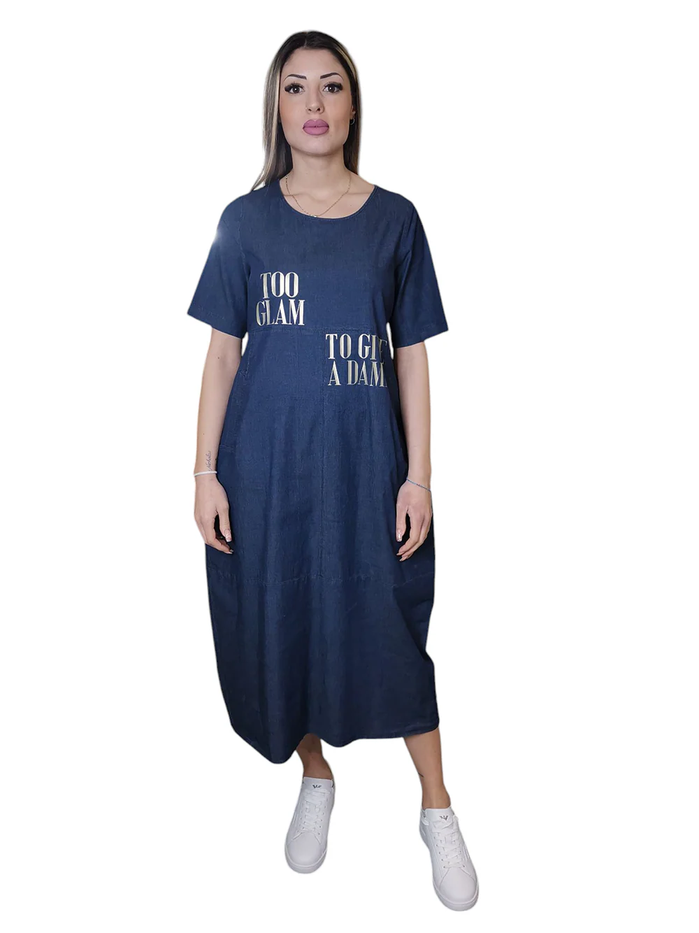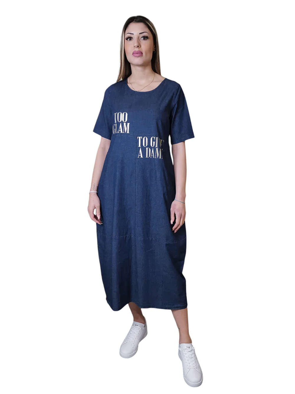 Questo abito in denim di cotone stretch blu, con stampa oro e la scritta “Too glam to give a damn”, è un inno alla femminilità audace ma raffinata. La linea ad uovo leggermente avvitata accarezza la silhouette con disinvoltura, mentre le tasche laterali aggiungono un tocco casual e pratico. La lunghezza sopra la caviglia e il tessuto morbido e fresco lo rendono ideale per accompagnarti con stile nelle giornate più dinamiche.