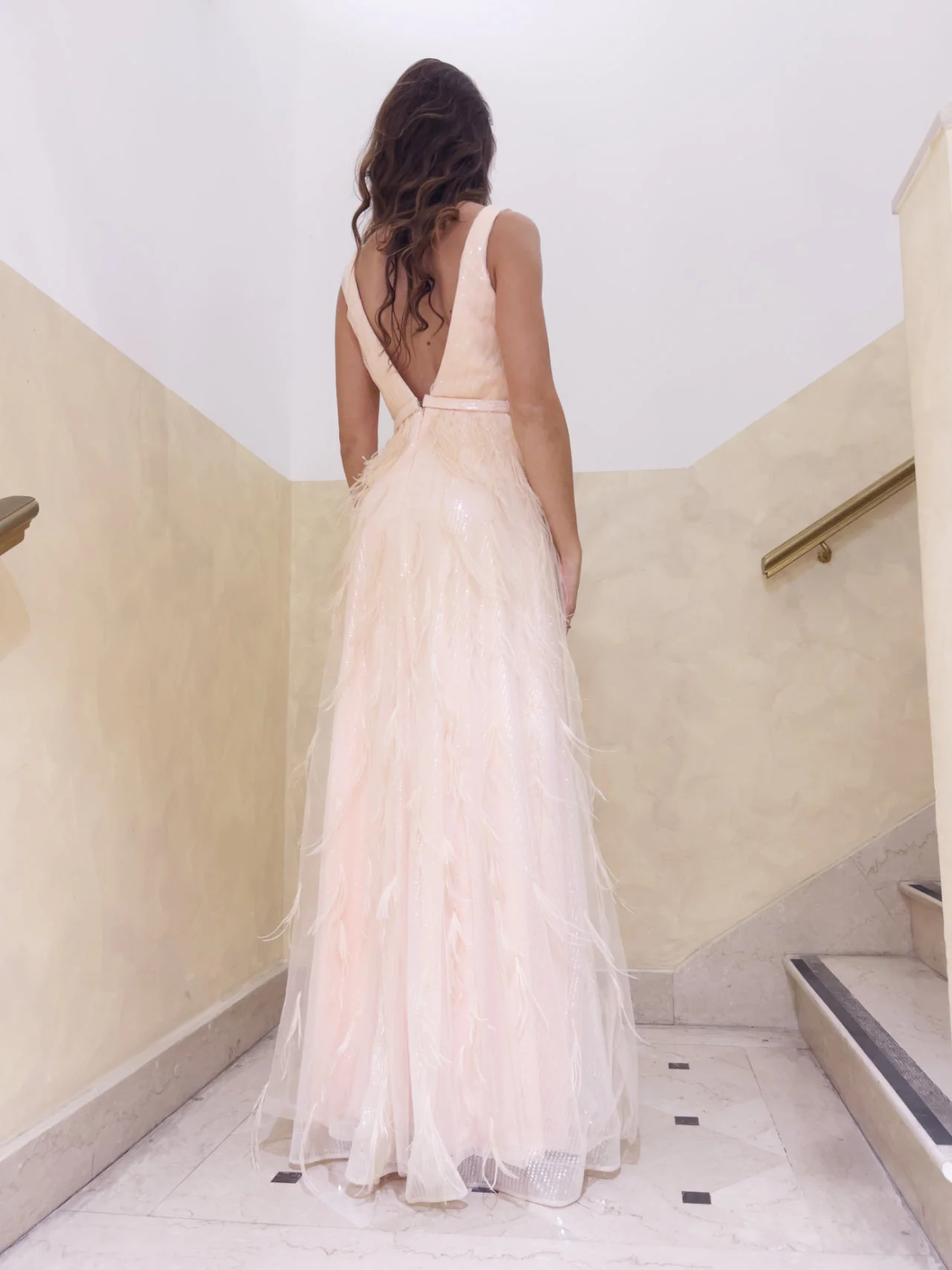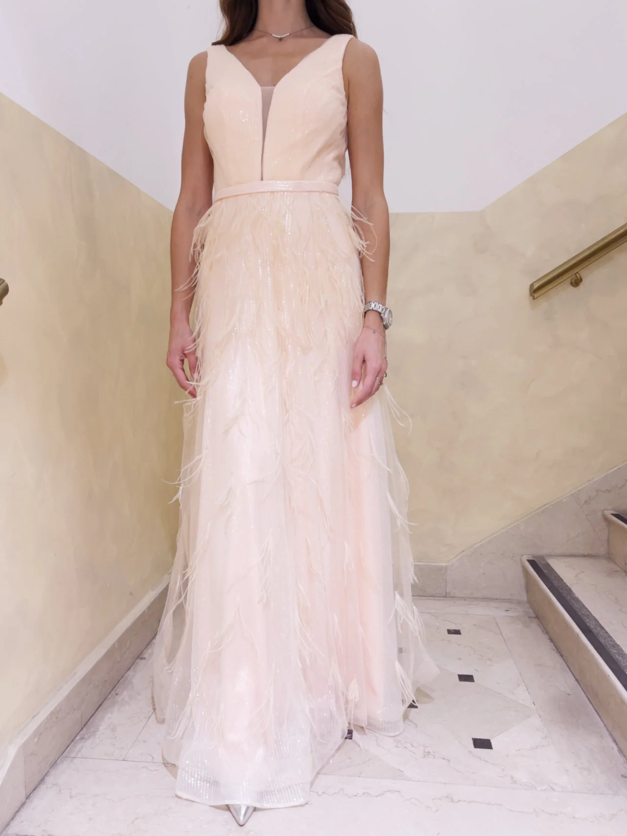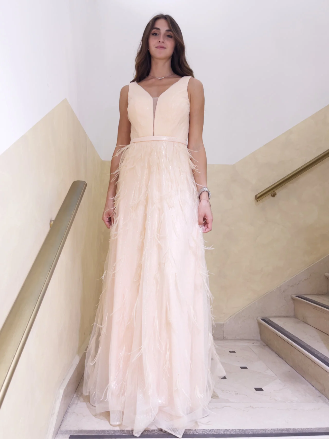 - Un abito da cerimonia da sogno! Foderato in raso e impreziosito da ricami di paillettes e piume. Un look irresistibile! Rendi unica la tua occasione speciale con questo abito da cerimonia. Una scelta audace ed elegante con ricami di paillettes e piume che ti regaleranno un look da sogno!