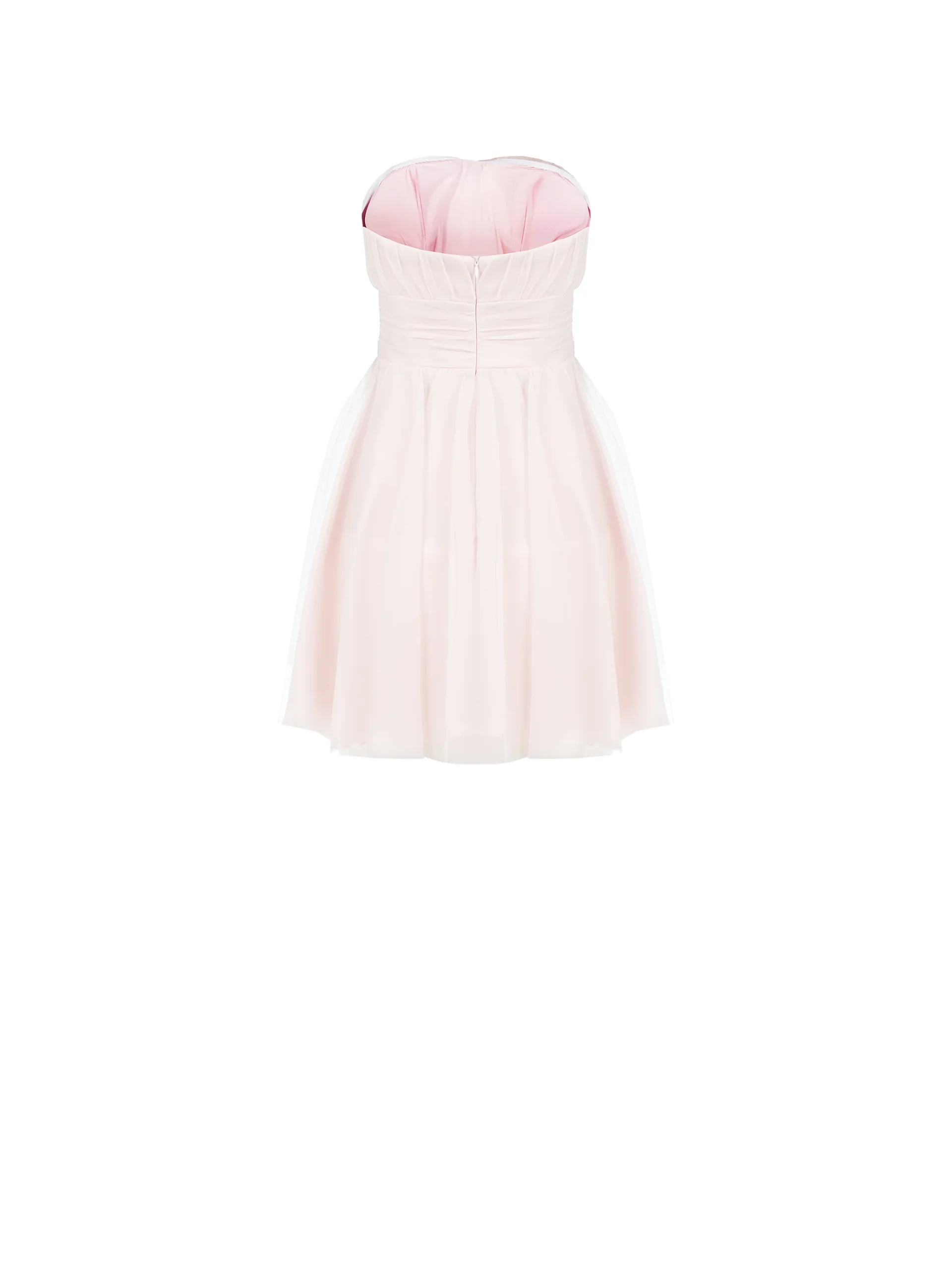 Linee eteree e un design romantico definiscono l’abito corto rosa pastello, un capo pensato per illuminare i momenti più importanti.