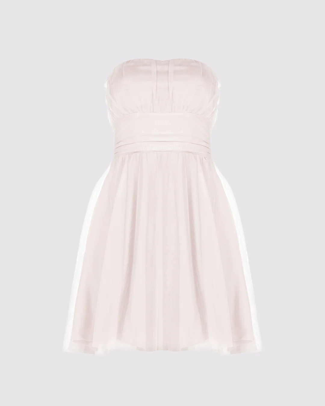Realizzato in leggera georgette, il suo design si apre con un corpetto a fascia, finemente lavorato con un’arricciatura che ne valorizza la forma. Il punto vita è messo in risalto da un’ampia fascia drappeggiata che introduce la gonna corta e svasata, la cui leggerezza è accentuata da uno strato superiore velato che crea un delicato gioco di volumi e movimento. La chiusura con zip posteriore assicura una vestibilità ideale, mantenendo pulita la linea del capo.