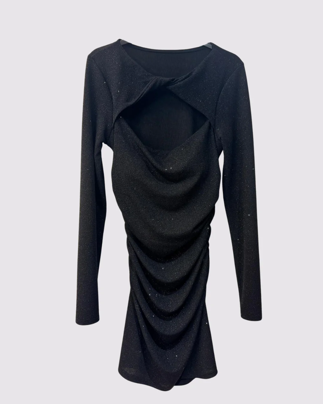 Abito corto in lurex, con apertura sulla scollatura. Maniche lunghe, color nero, taglia unica elasticizzato di Emma.