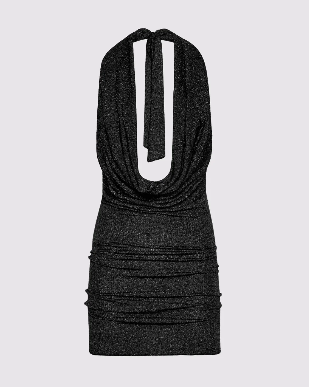 Abito corto nero del brand Effek, con ampio scollo e vestibilità elasticizzata. Tessuto: Lurex Dettagli: Capo dotato di scollo profondo con allacciatura al collo Composizione: 77%pl 17%mtl 6%ea Lavaggio: Si consiglia lavaggio a mano in acqua tiepida