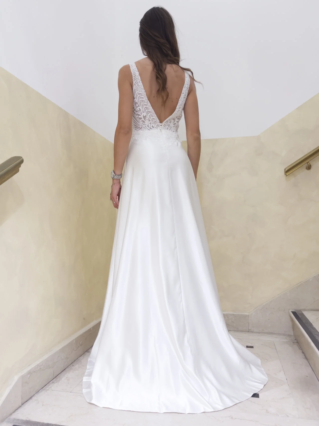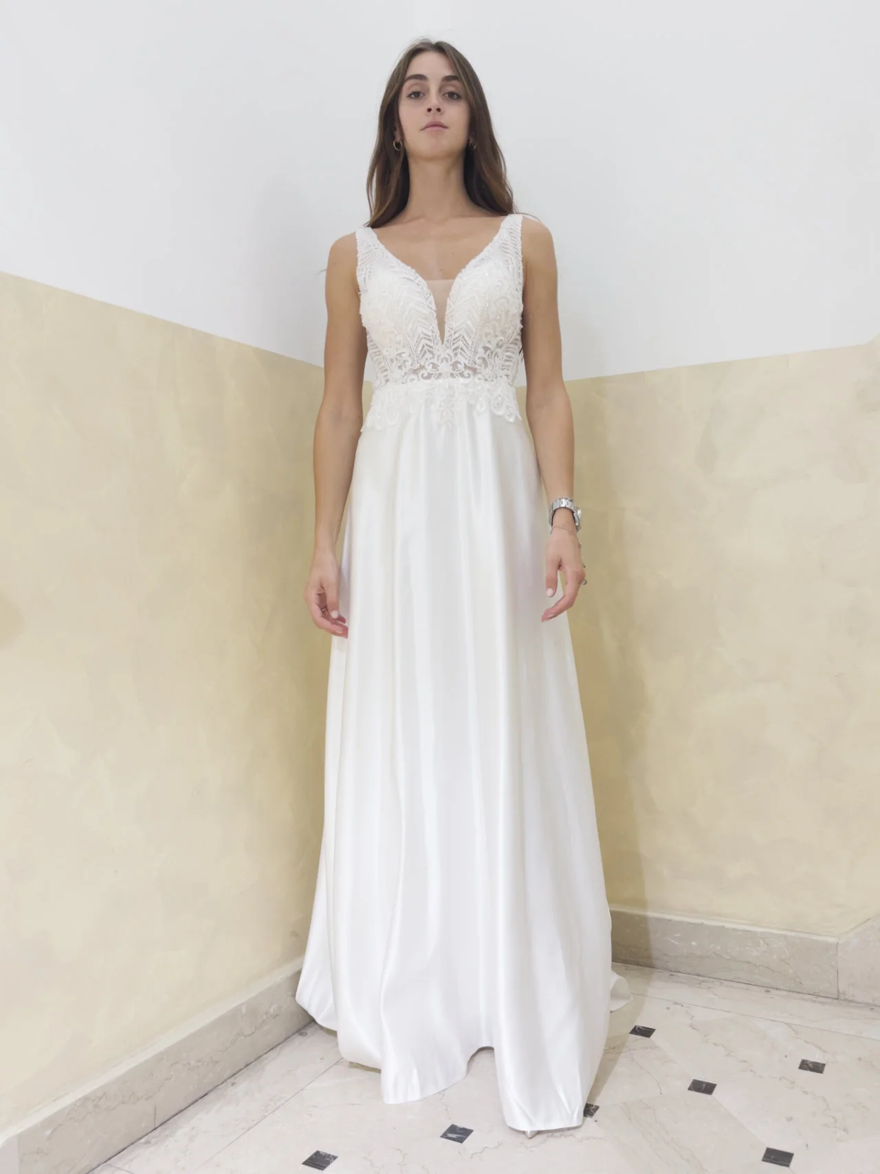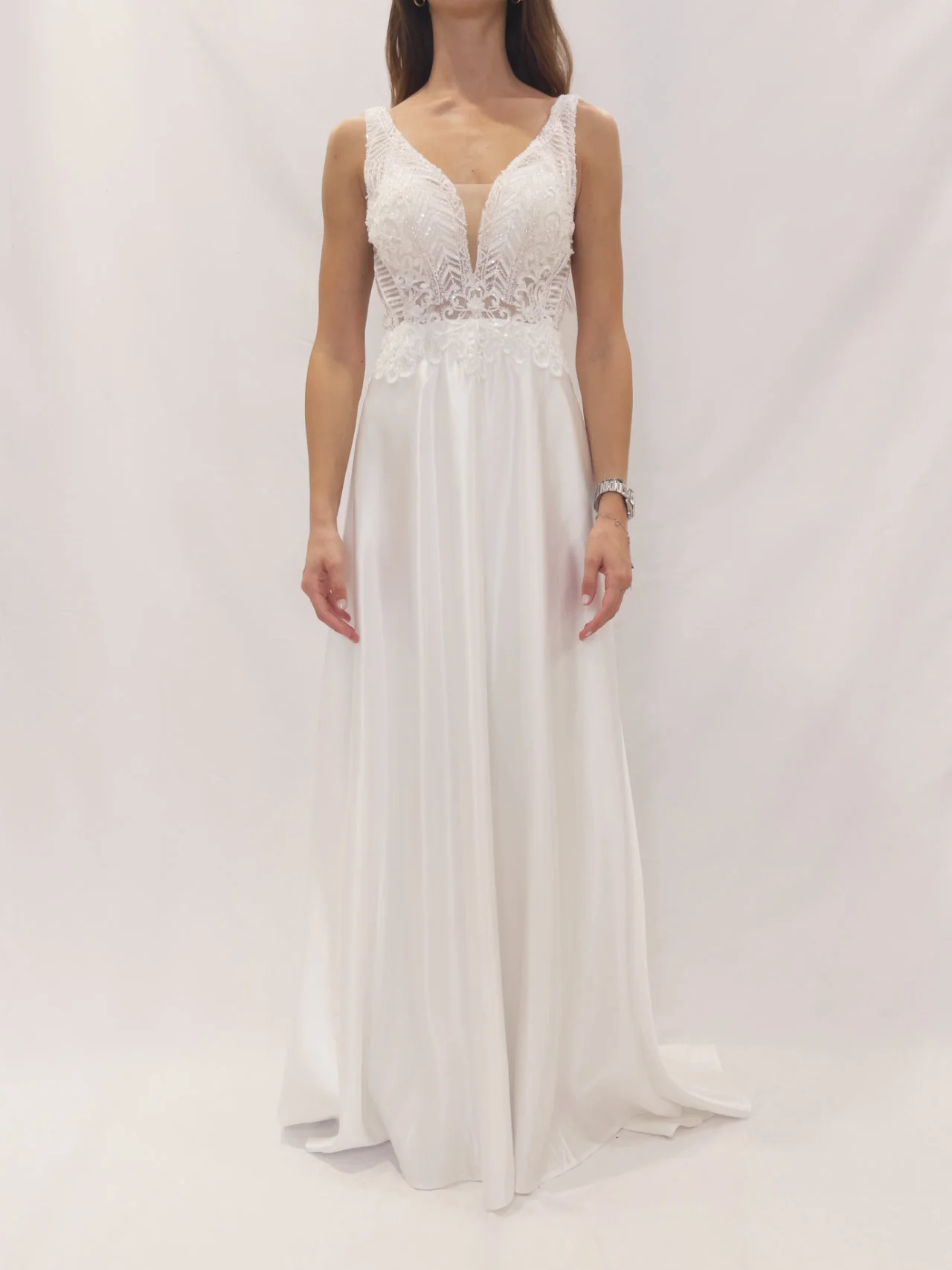 Brillare di gioia con questa splendida creazione! Il sogno di ogni sposa diventa realtà con il ricamo di paillettes sulla parte superiore, rendendo il giorno indimenticabile! Materiale: Dettagli: coppe imbottite, chiusura cerniera invisibile dietro Taglia e Fit: modella alta 178 cm indossa la misura Slunghezza davanti: 156 cm nella taglia Slunghezza dietro: 170 cmpetto: 88 […]