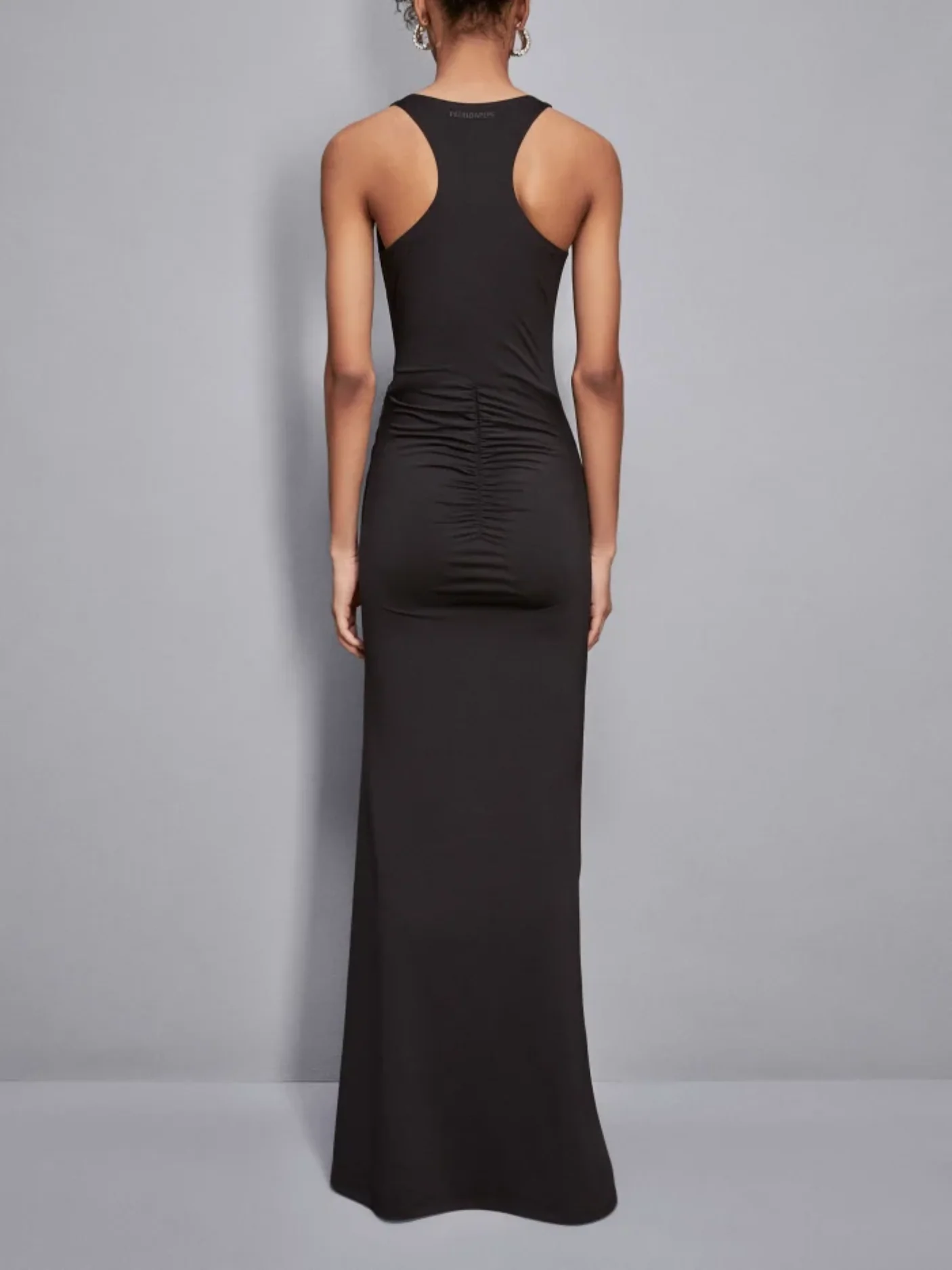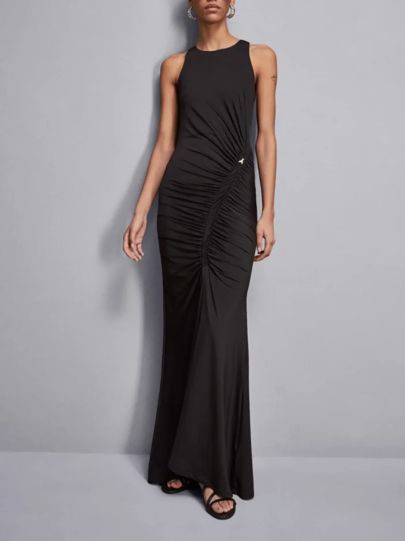 Realizzato in jersey crepe stretch, il tessuto segue con naturalezza le linee del corpo, mentre i drappeggi strategici aggiungono profondità e movimento, donando un tocco di eleganza sofisticata.