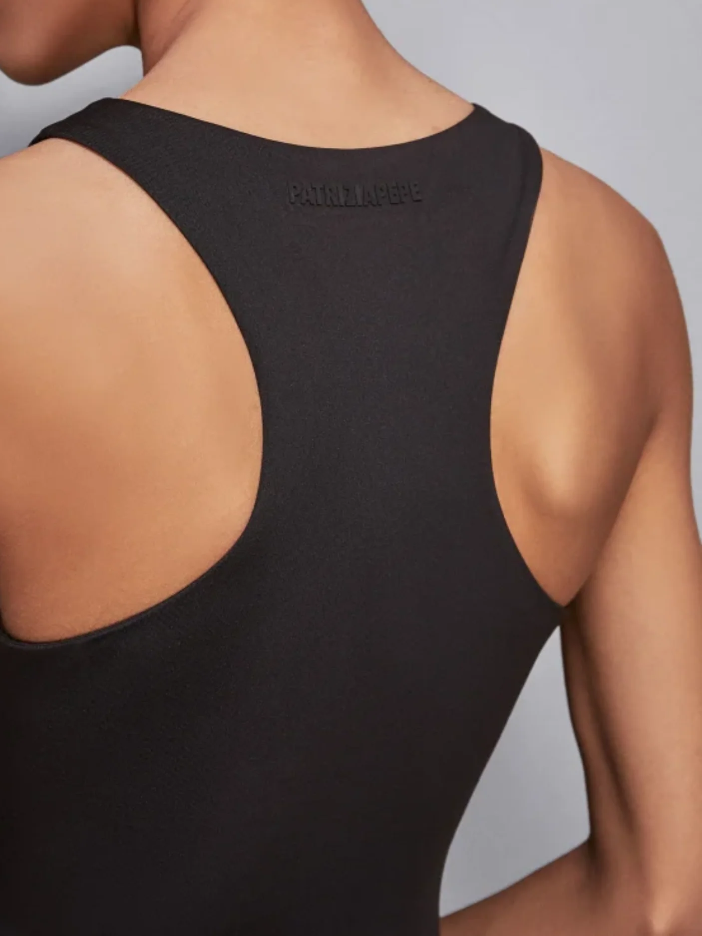 Lo scollo tondo e l’assenza di maniche esaltano il portamento e la femminilità con semplicità e classe. Il logo tono su tono è un dettaglio discreto che completa il look con una firma distintiva.