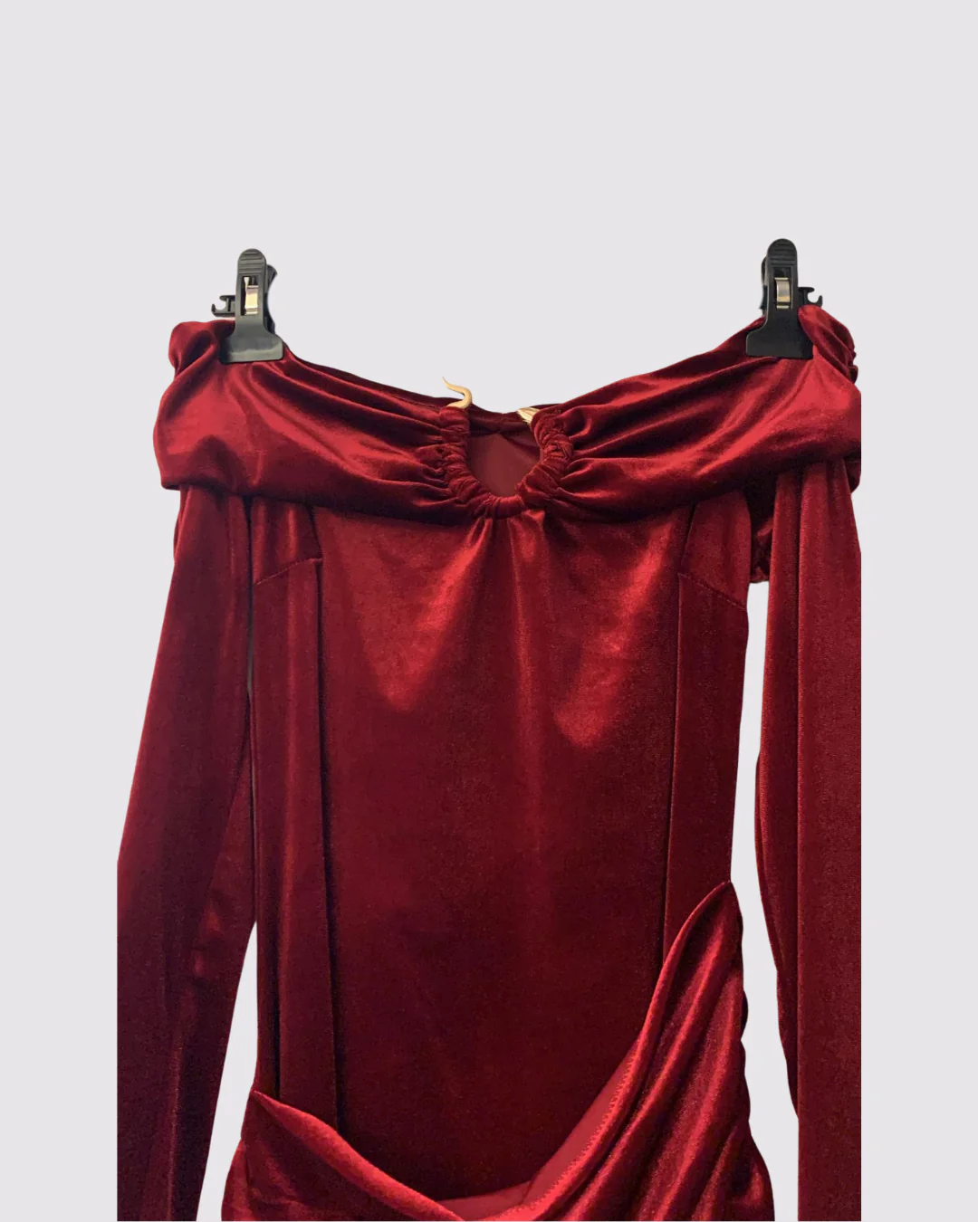 Abito lungo in velluto bordeaux, con dettaglio sul décolleté.