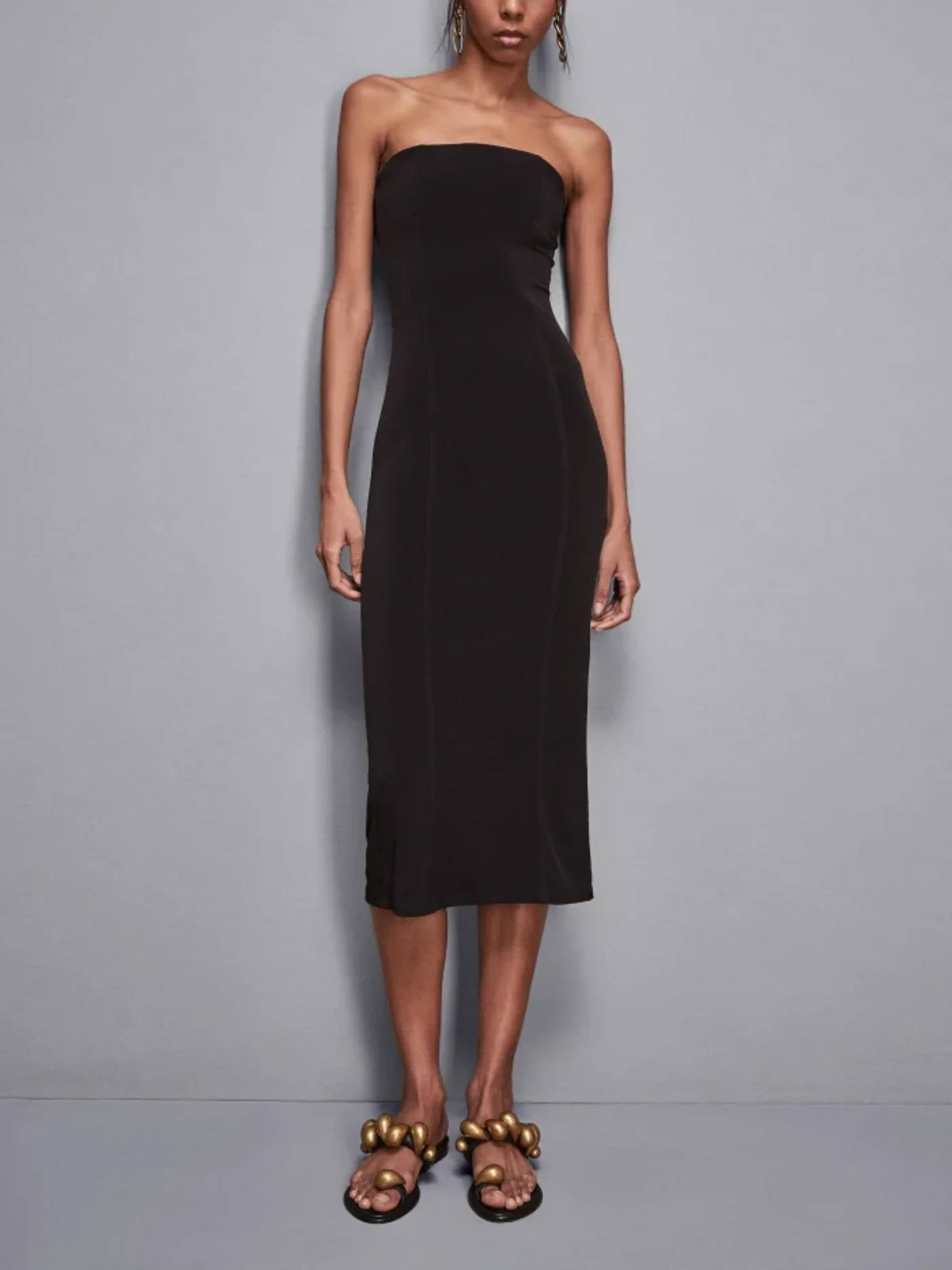 Raffinato ed essenziale, l’abito Essential è il capo ideale per valorizzare la silhouette con classe. Realizzato in morbido jersey crepe stretch, si adatta perfettamente alle forme grazie alla sua vestibilità skinny, mentre lo scollo a fascia dona un tocco di femminilità e modernità.
