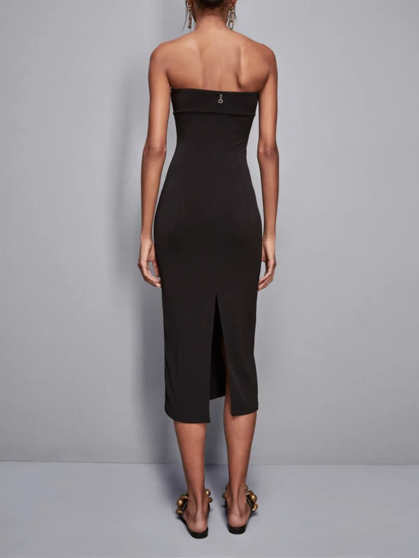 Un dettaglio distintivo è il ciondolo Fly sul retro dello scollo, una firma discreta che aggiunge carattere al design. Perfetto per un evento speciale o una serata elegante, questo abito si abbina con facilità a sandali minimal o décolleté per un look sofisticato.