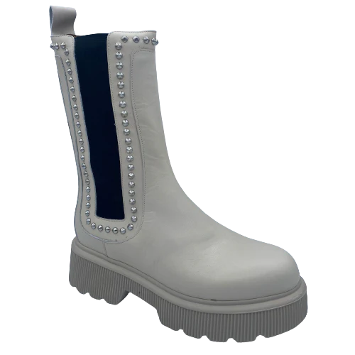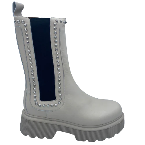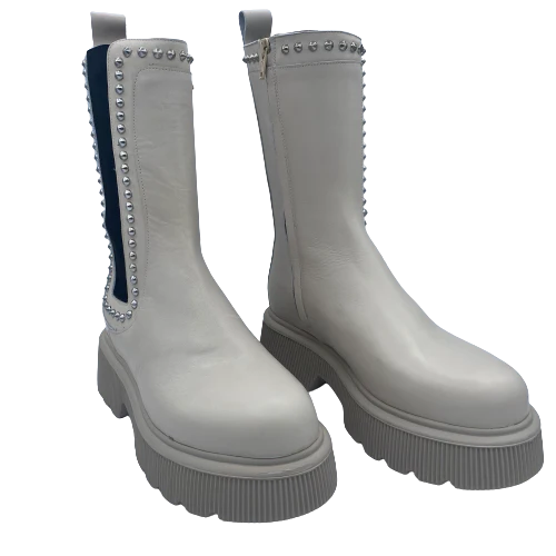 Colore: ghiaccio-Materiale: vitello (vera pelle)-Fondo in gomma nero-Dettaglio con borchie color argento-Chiusura con zip