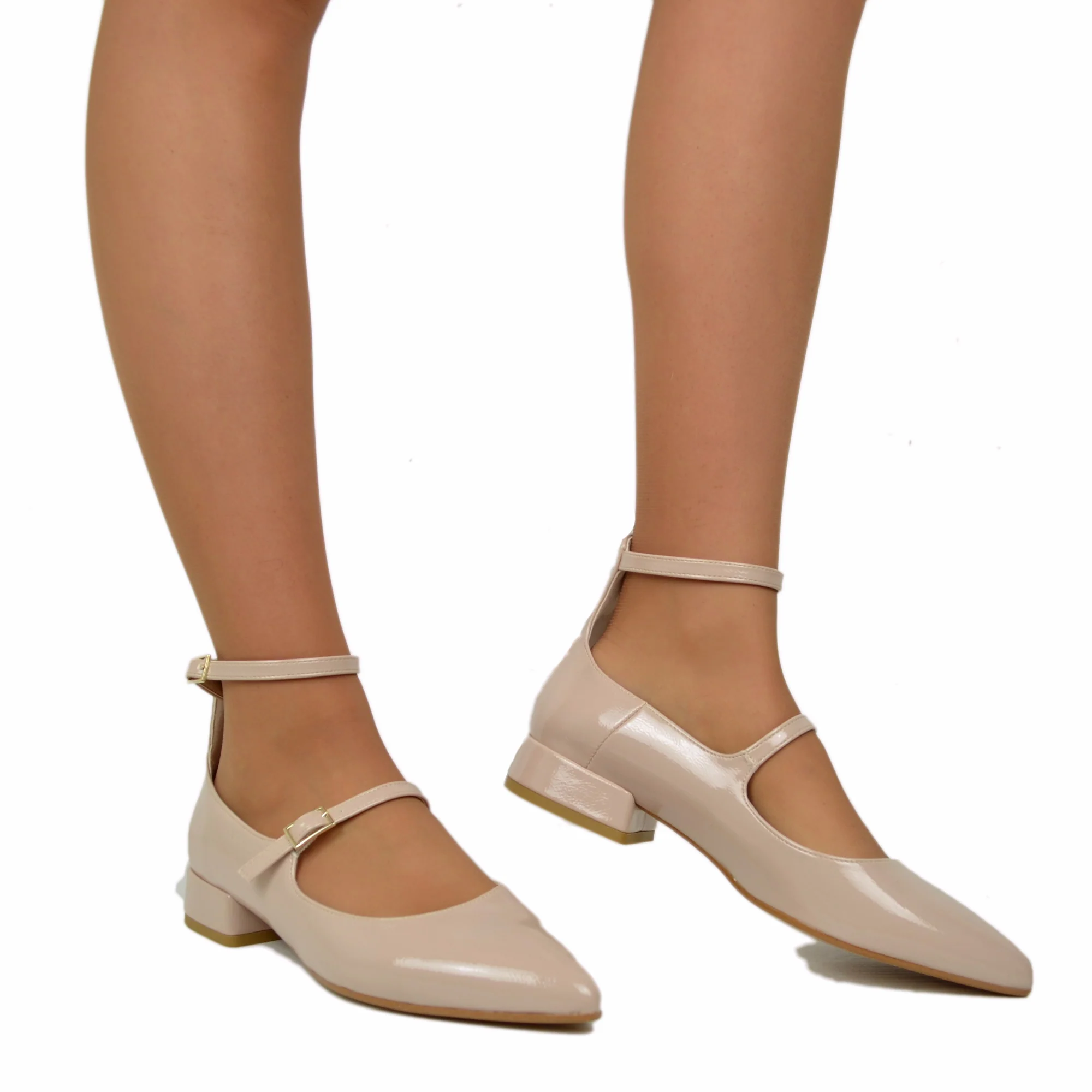 Ballerine Donna a Punta color Carne, in similpelle Lucida, Made in Italy, con fibbie regolabili.
