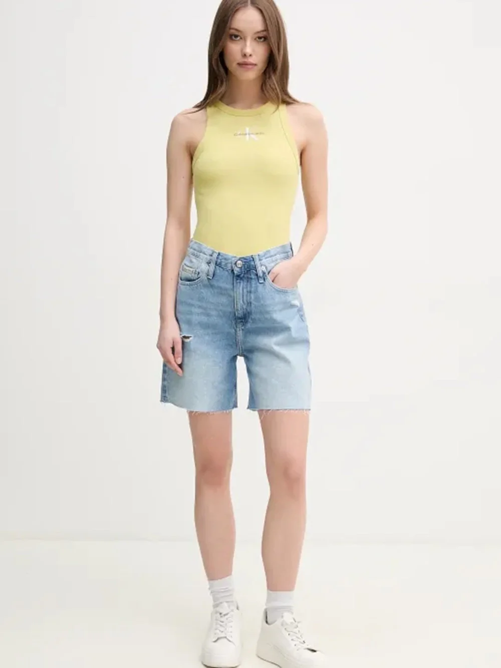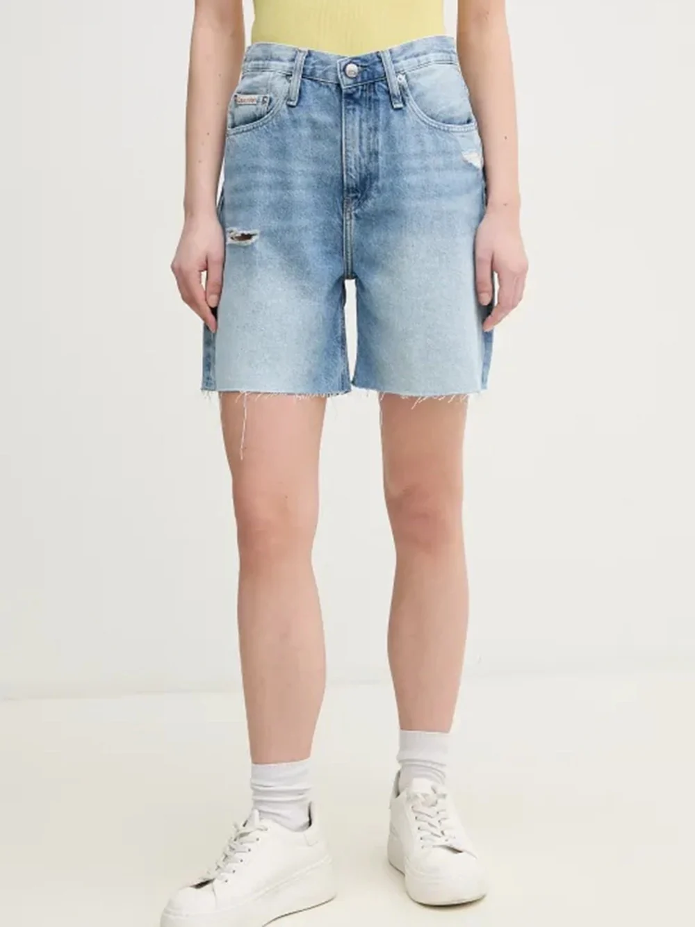 I bermuda Calvin Klein in denim chiaro uniscono stile casual e dettagli di tendenza per un look fresco e versatile. Realizzati in cotone denim leggero e morbido, offrono un taglio relaxed che garantisce comfort e libertà di movimento. La vita alta valorizza la silhouette, mentre i piccoli strappi donano un tocco grintoso e vissuto. Il design classico a cinque tasche, arricchito dai rivetti con logo Calvin Klein e dall’etichetta logata, conferisce autenticità e carattere. Perfetti da abbinare a T-shirt, top o camicie oversize per un outfit estivo dall’anima contemporanea.