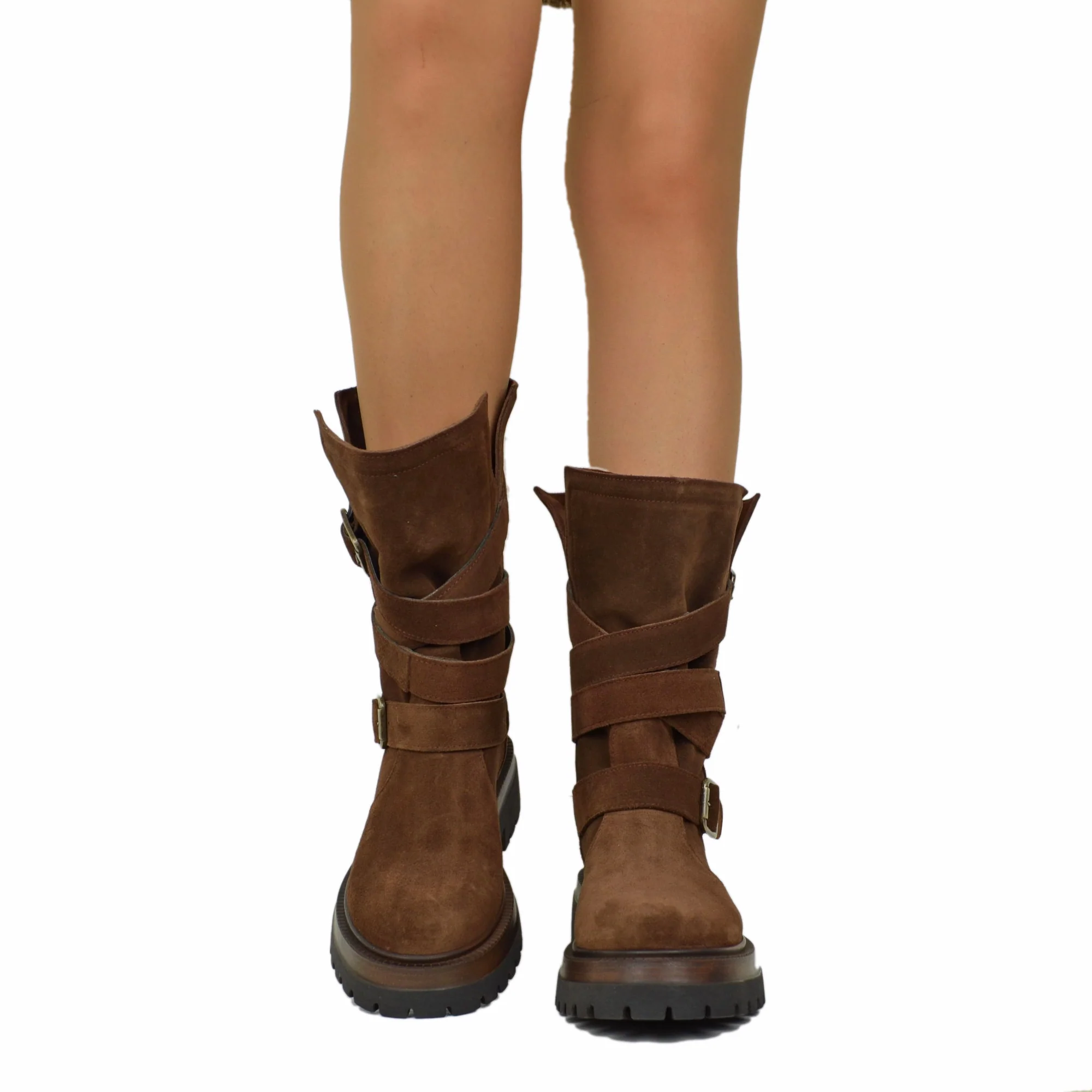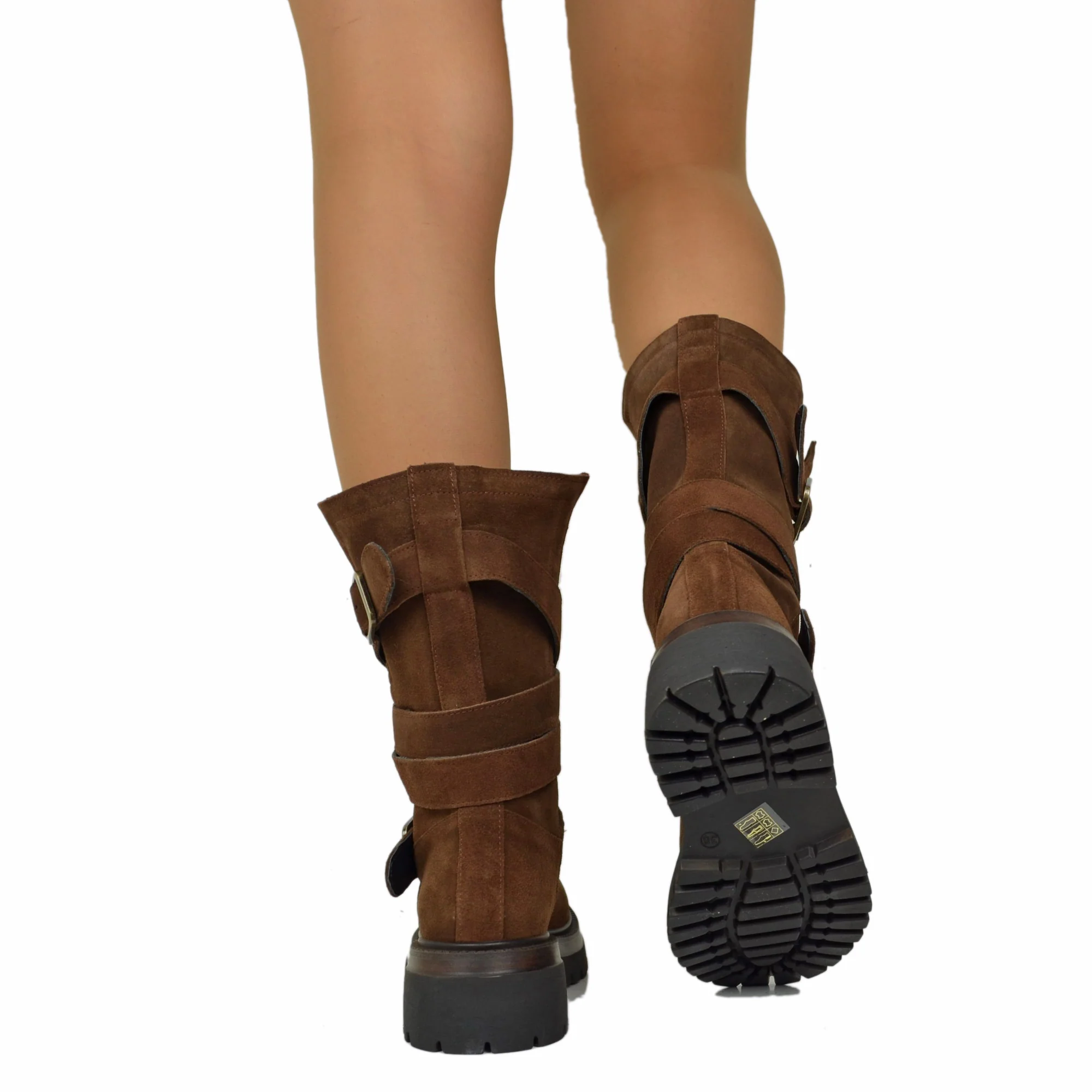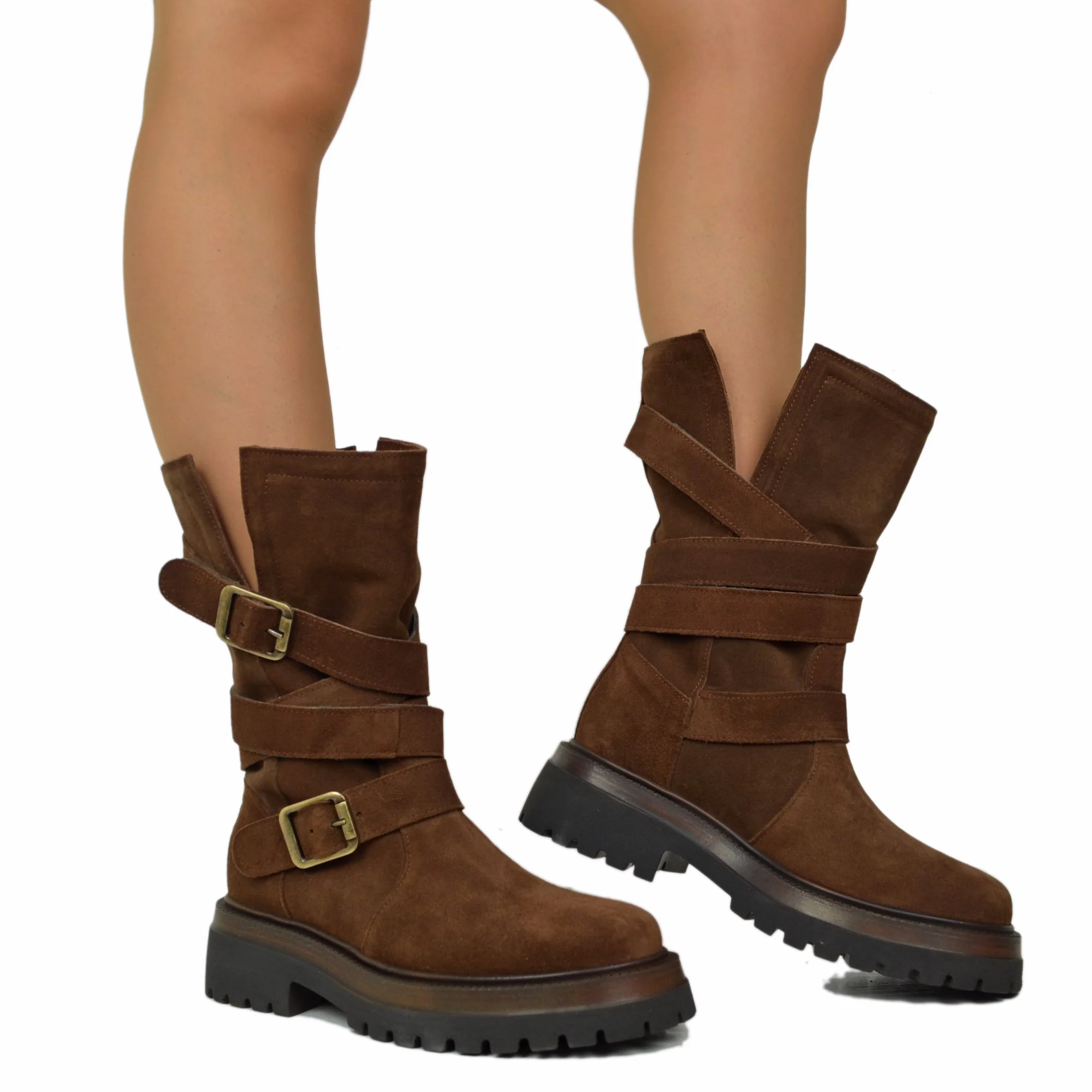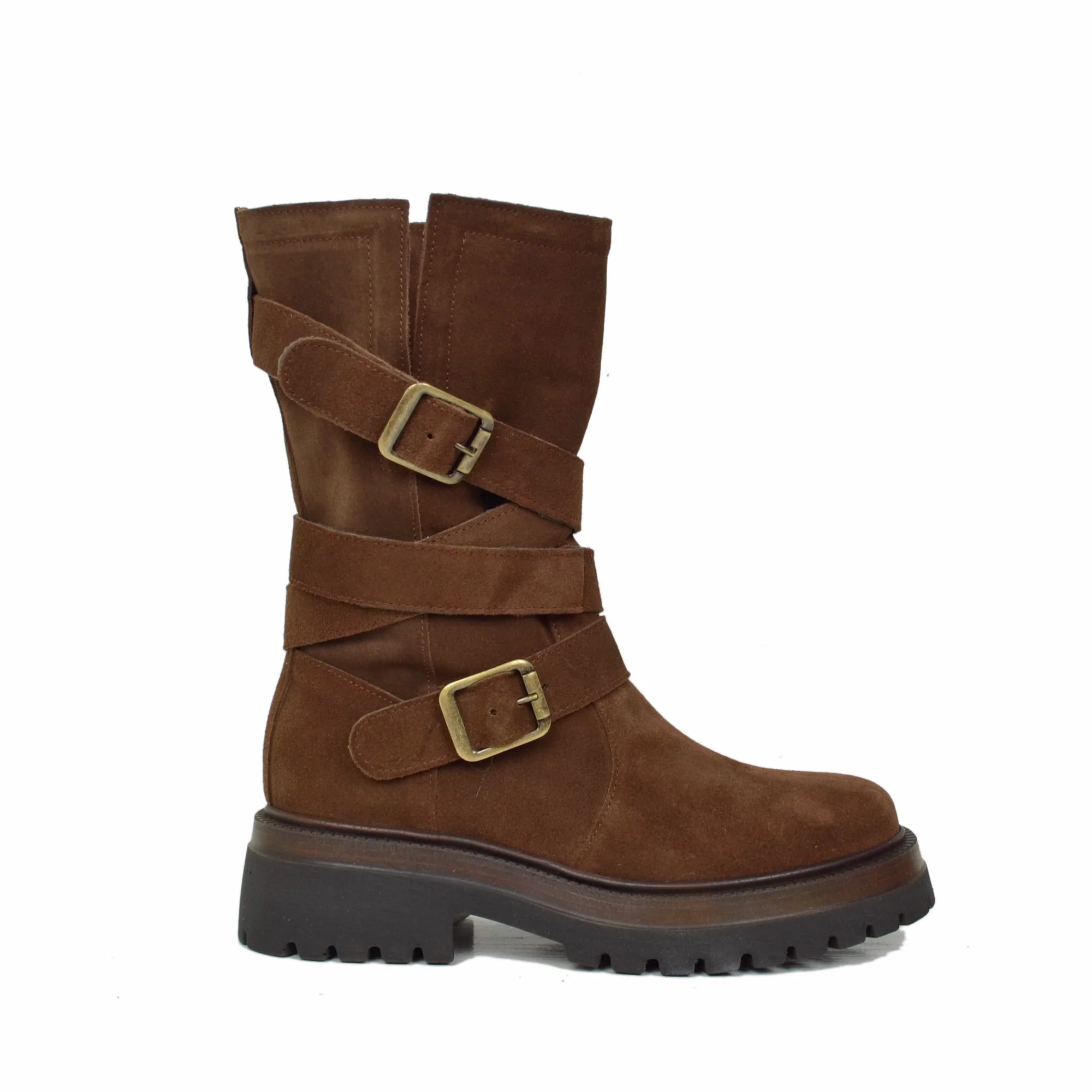 Biker Boots Donna in Pelle Scamosciata Marroni Made in Italy con Fibbie