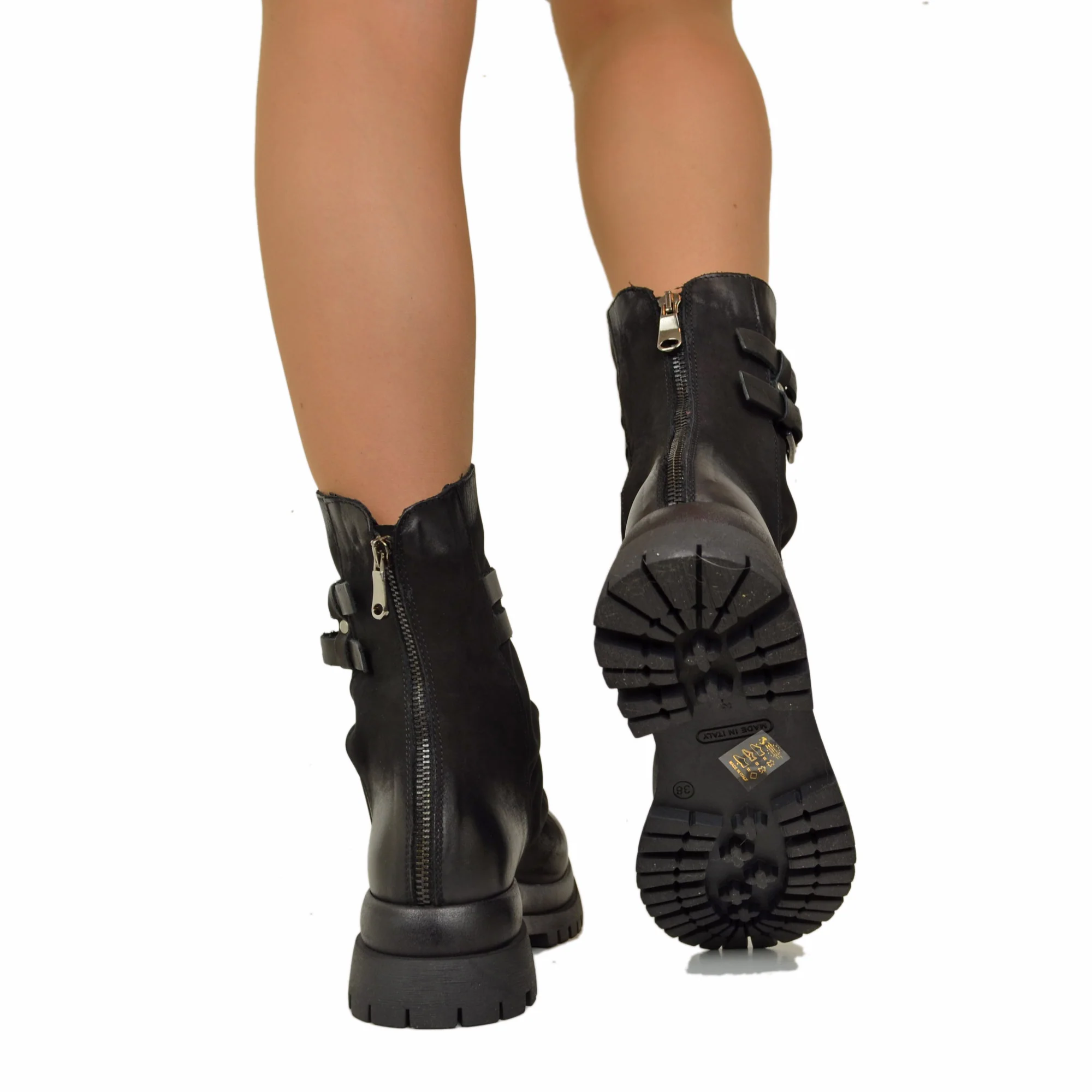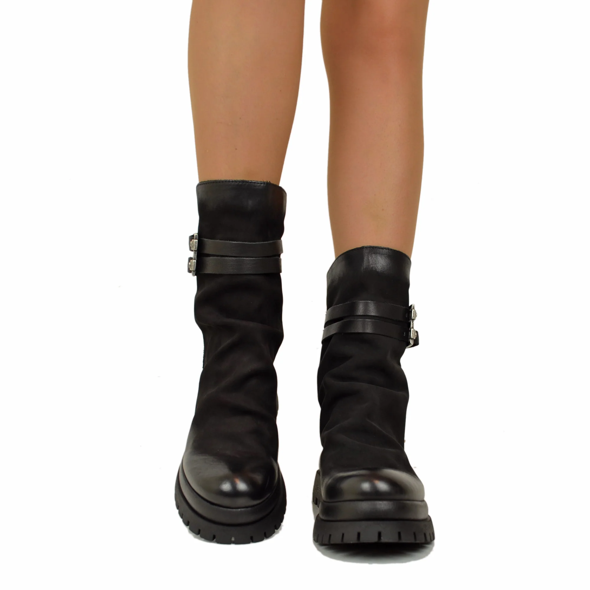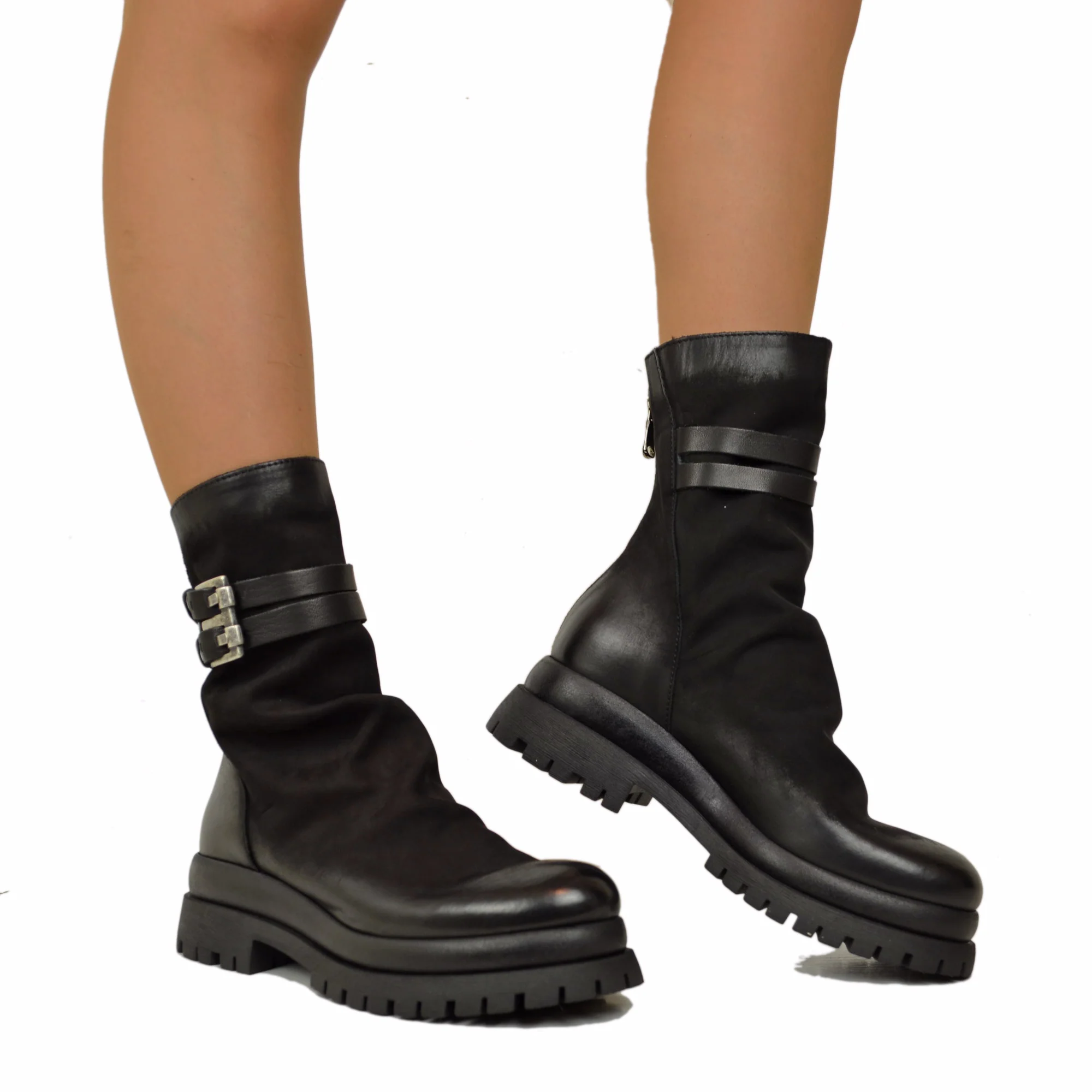 Biker Chunky boots Pelle Nabuk Stivaletti alla Caviglia Zip Posteriore Neri