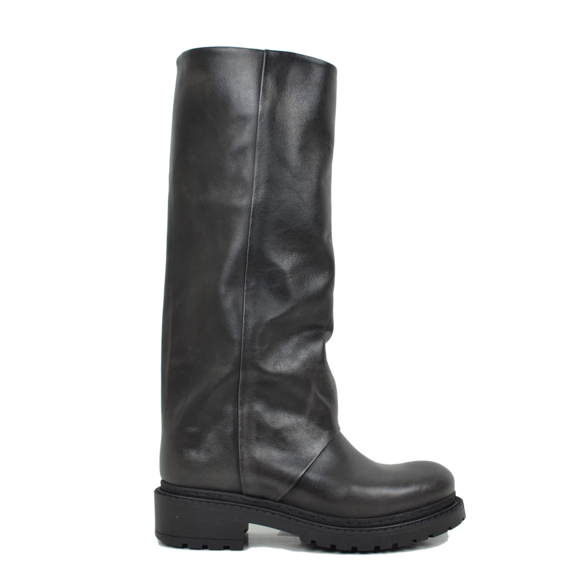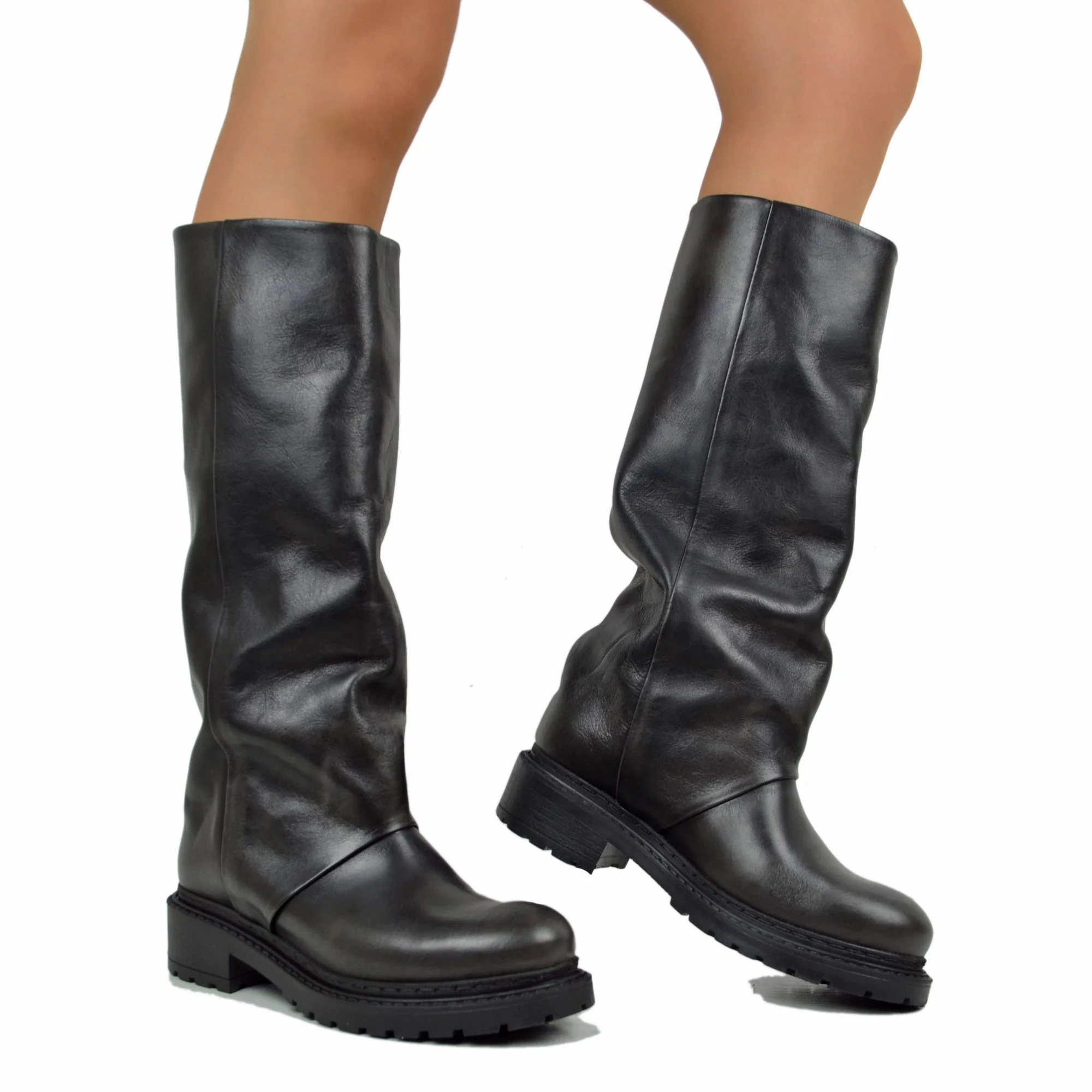 Biker Moto Grigio Asfalto Alti con Ghetta in Vera Pelle Fondo in Gomma
