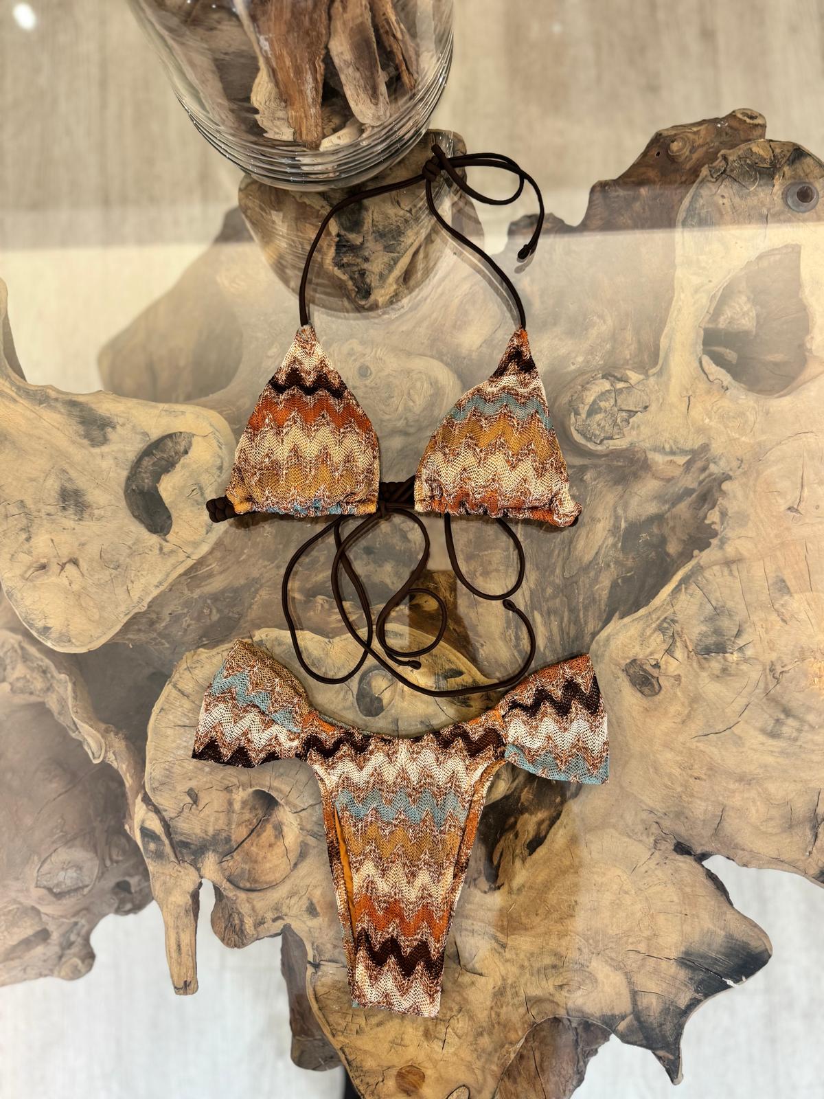 Bikini Triangolo regolabile e Slip brasiliano fisso a fantasia geometrica marrone, dotato di imbottitura interna estraibile. Composizione: 95% poliestere, 5% elastan Descrizione: bikini triangolo regolabile e slip fisso. Capo dotato di imbottitura interna estraibile e treccina in lycra su slip.