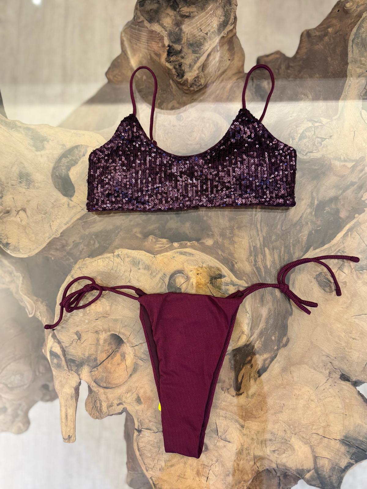 Bikini viola con top a fascia in paillettes e slip regolabile in costina, realizzato in tessuto elasticizzato.