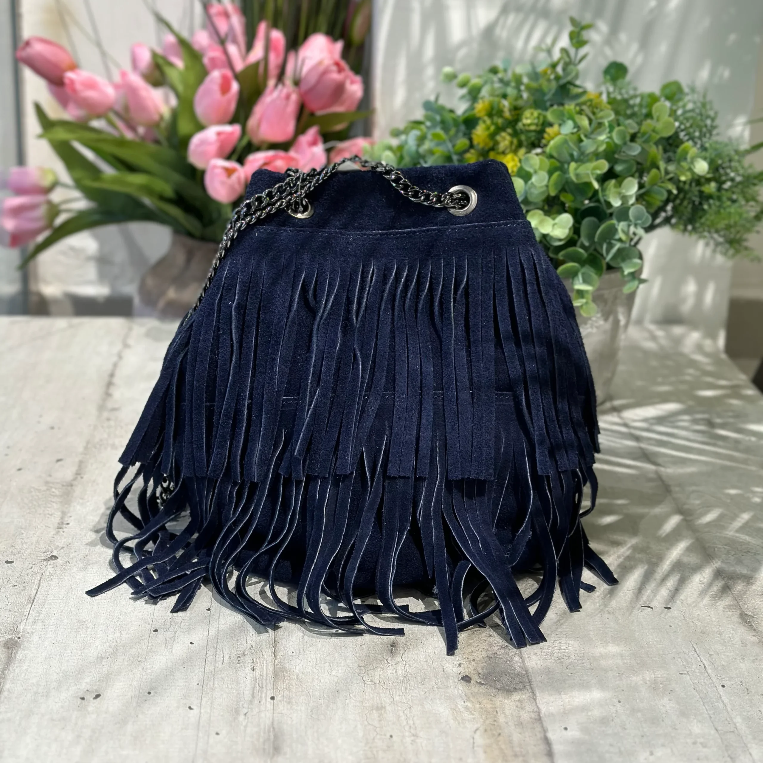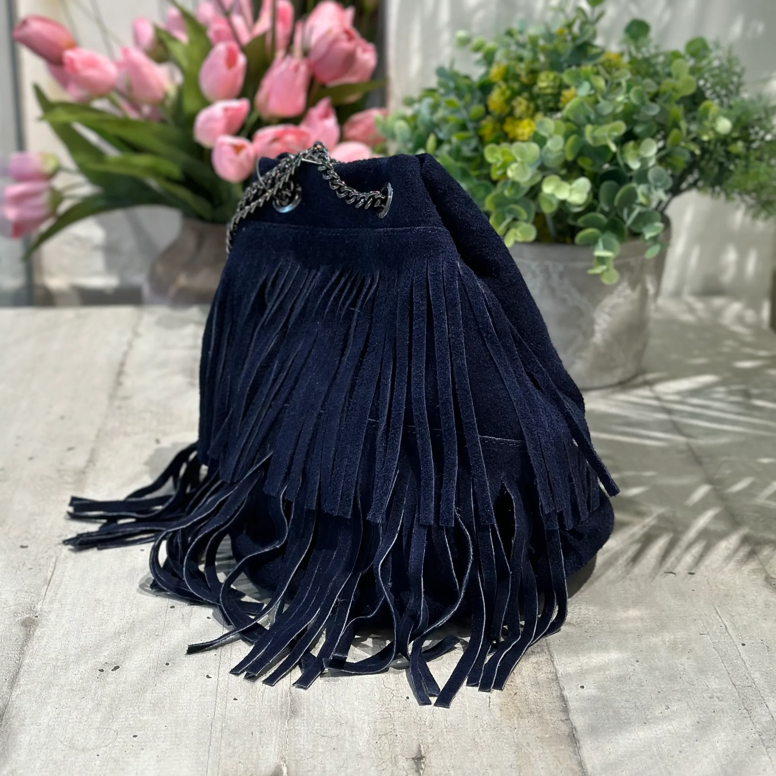 Borsa a secchiello in pelle scamosciata Blu Scuro con frange e catena fumè