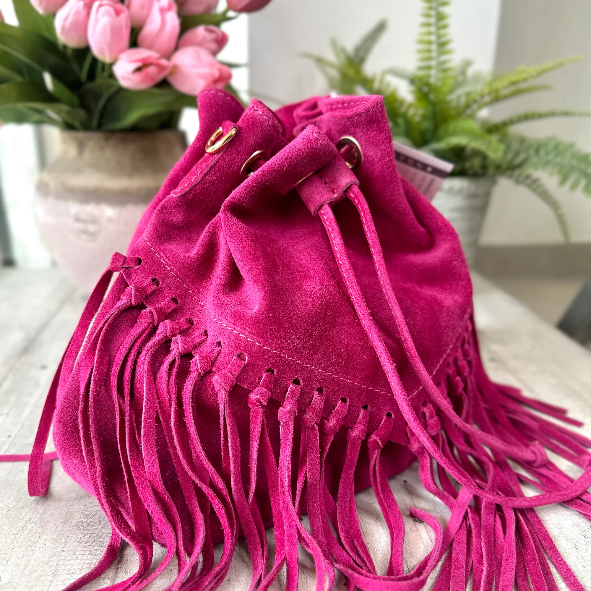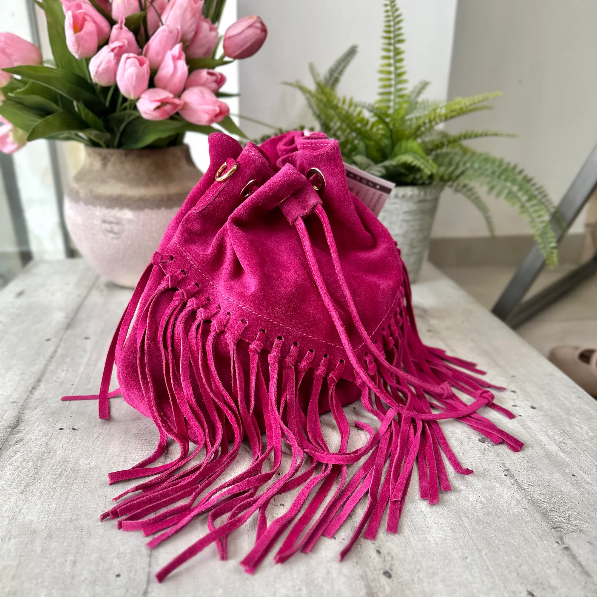 Borsa a Secchiello con Frange Fuxia in Pelle Scamosciata KIKKIBAGS EVA