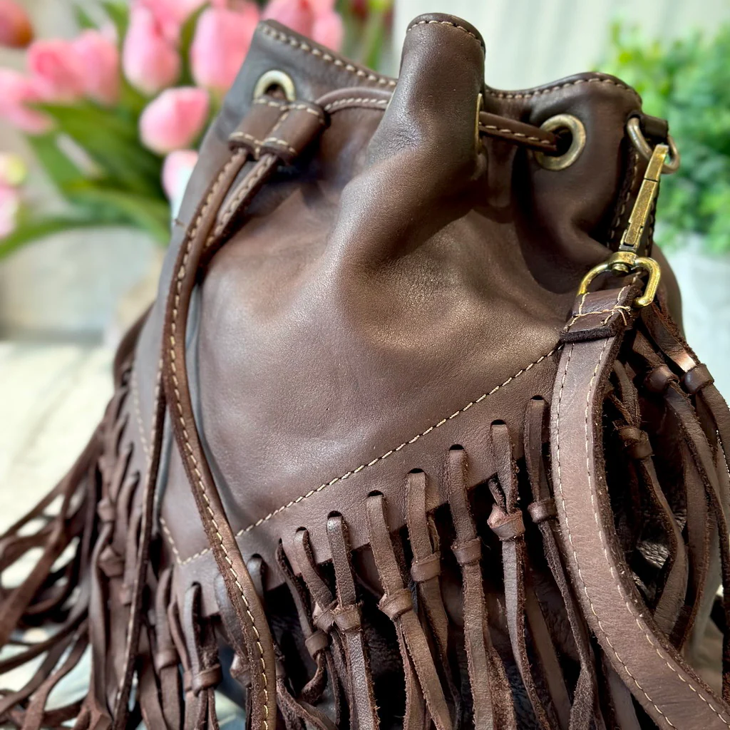 Borsa a Secchiello con Frange Testa di Moro in Pelle Nabuk Vintage
