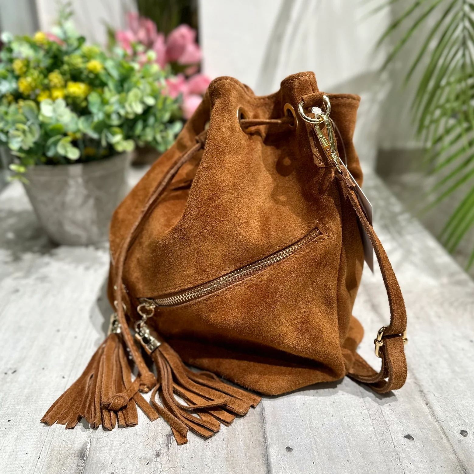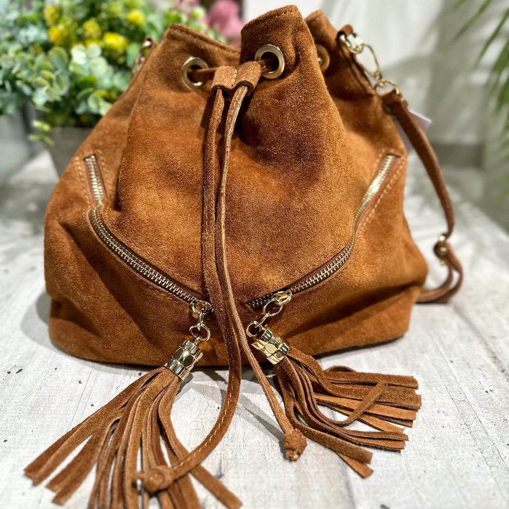 Borsa a Secchiello in pelle scamosciata con zip laterali Dorate e Nappine!