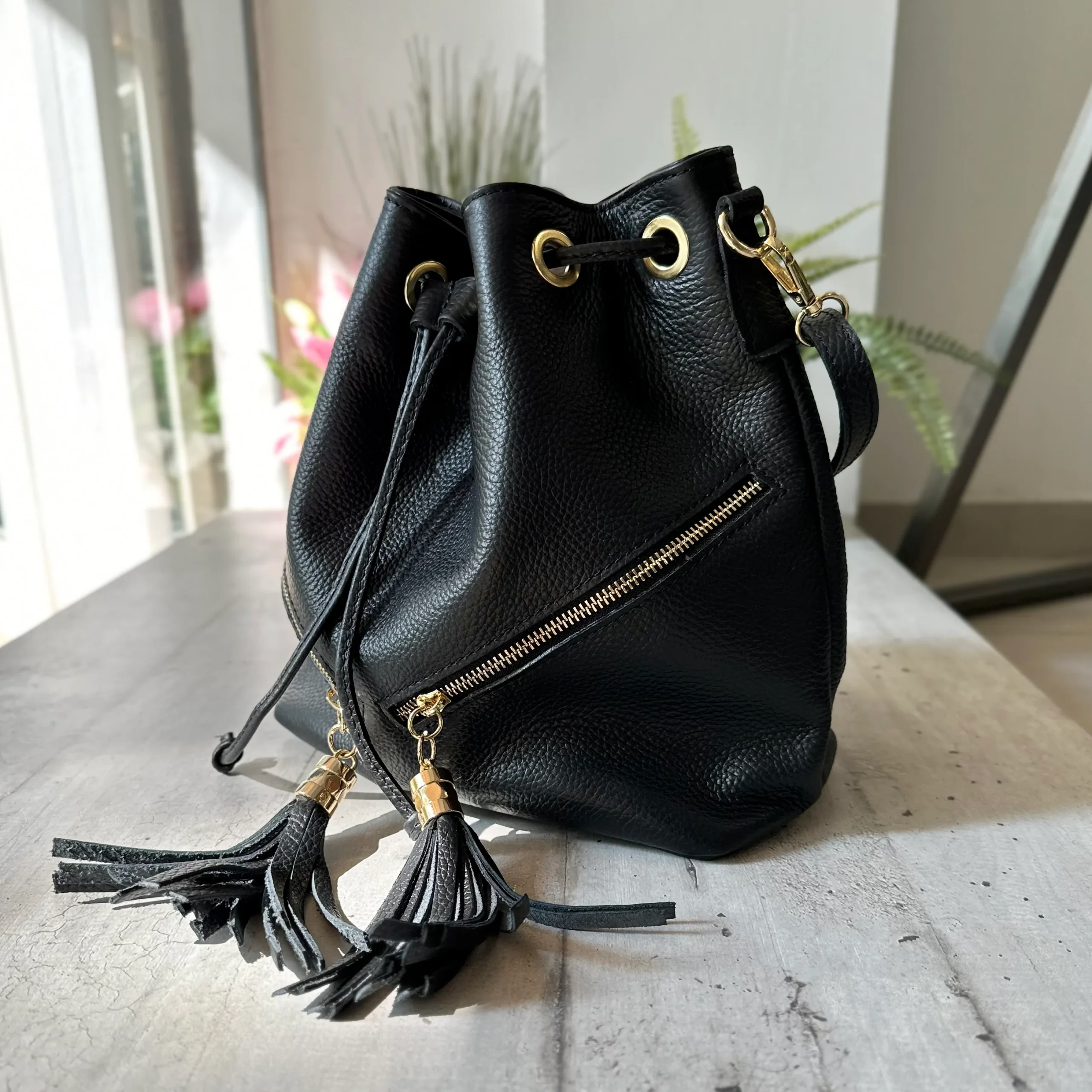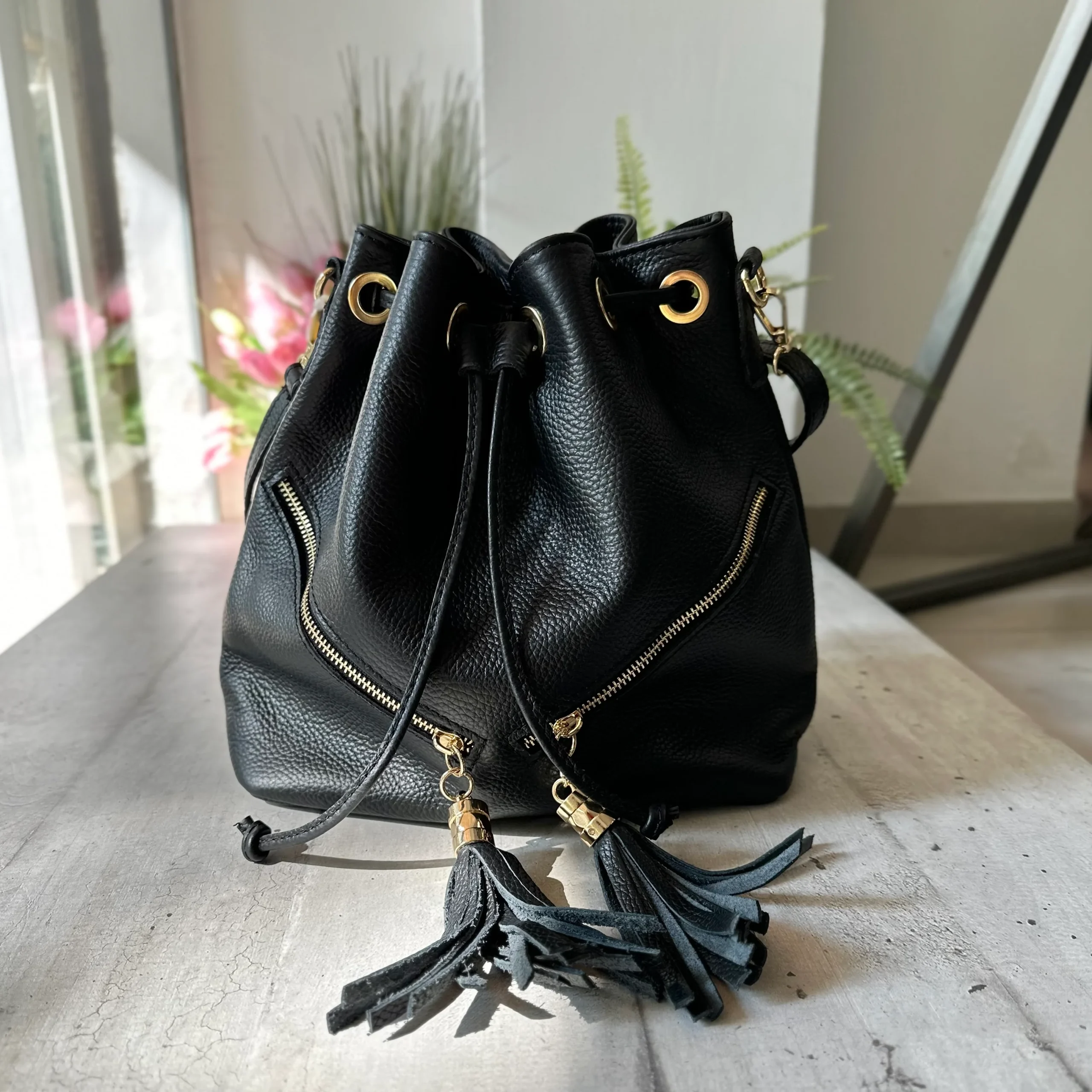Borsa a Secchiello con Nappine Nero in Pelle Bottolata Doppia Zip!