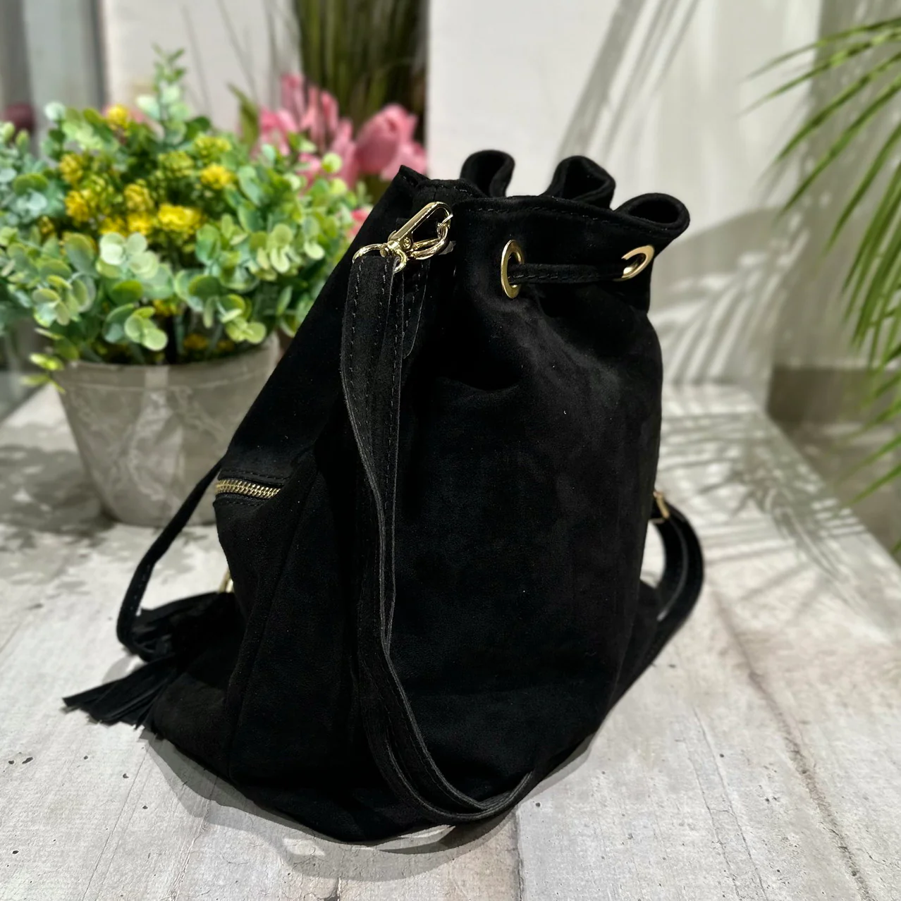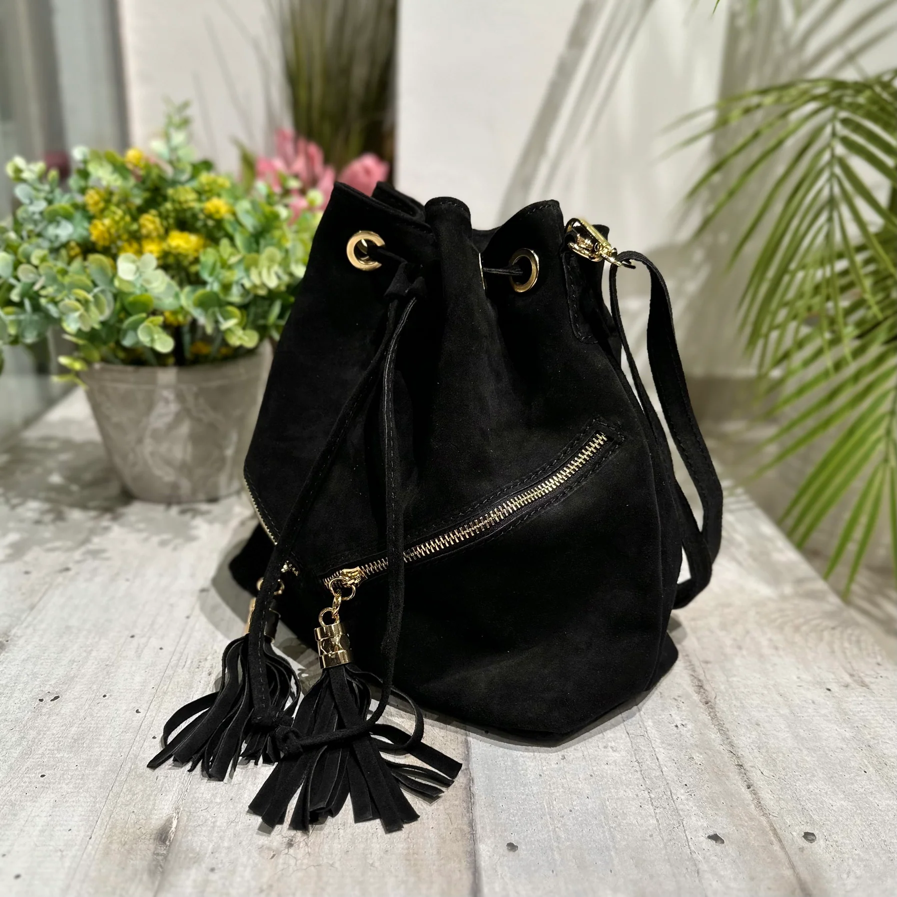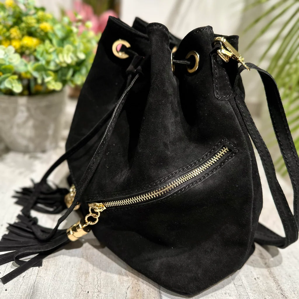 Borsa a Secchiello in pelle scamosciata con zip laterali Dorate e Nappine!