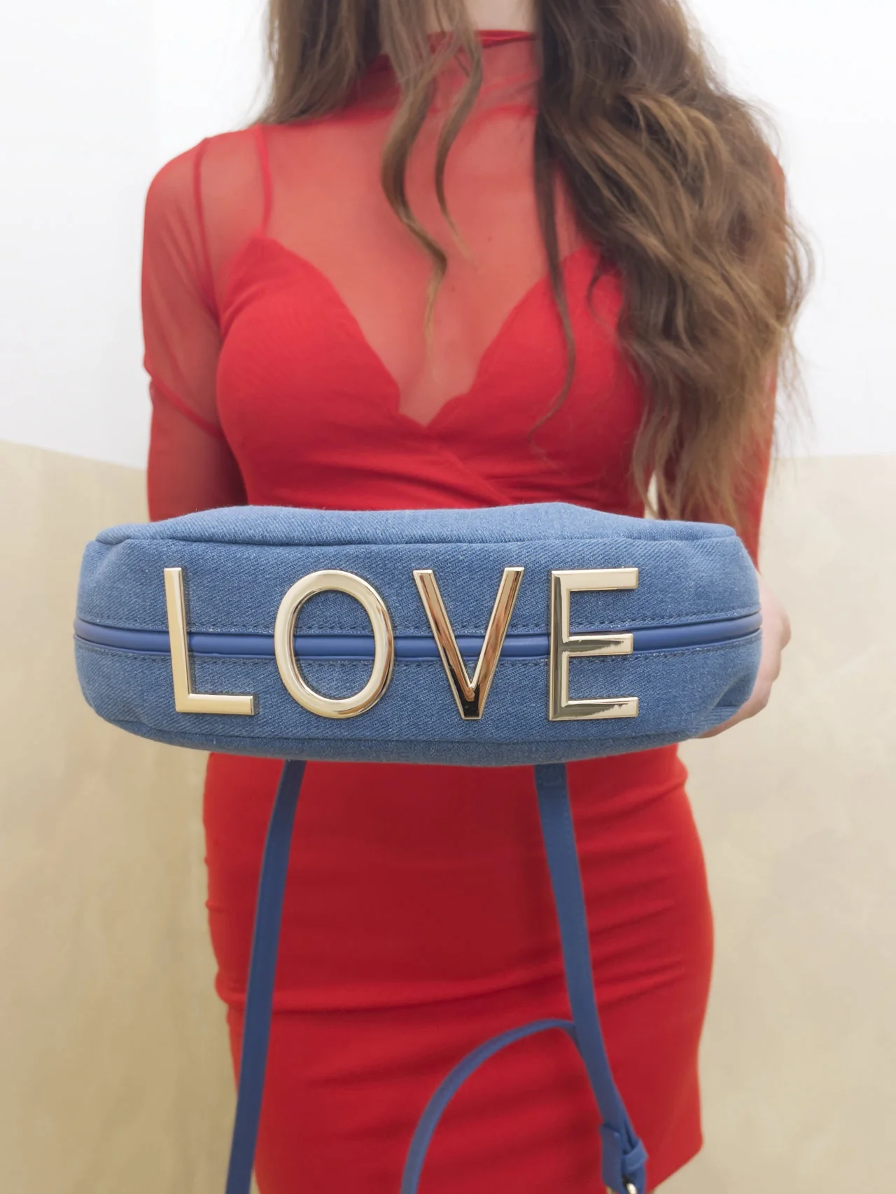 - Borsa piccola da donna a forma di mezza luna in tessuto jeans con scritta metallica LOVE sotto.