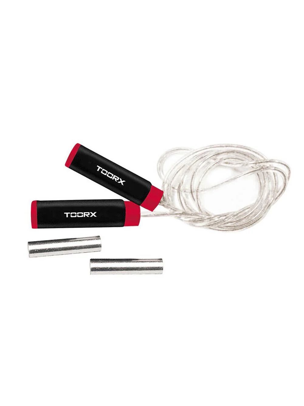 Toorx Corda Salto Professionale Con Pesi Dettagli:Impugnatura ergonomica soft touch Pesi rimovibili da 250 gr. ciascuno Impugnatura girevole su cuscinetti a sfera Cavo in acciaio, per una rotazione fluida e veloce