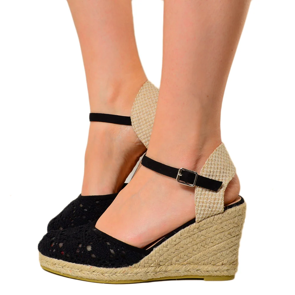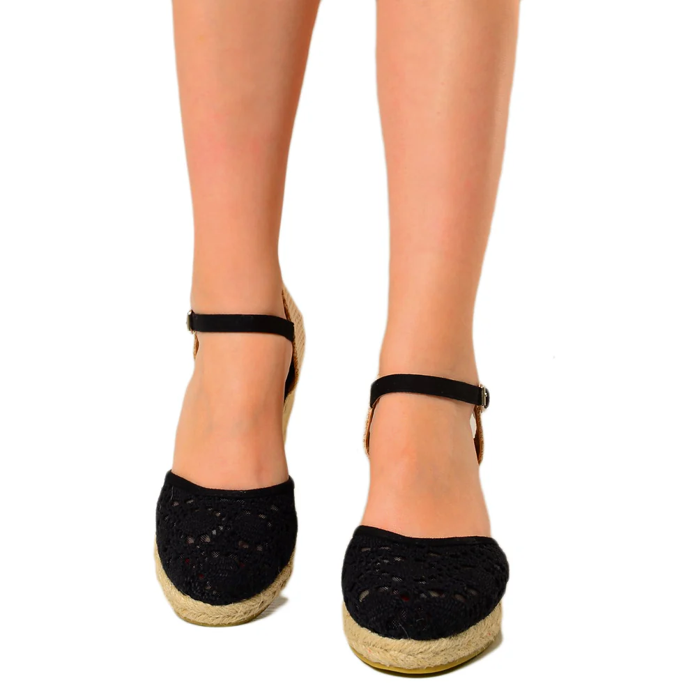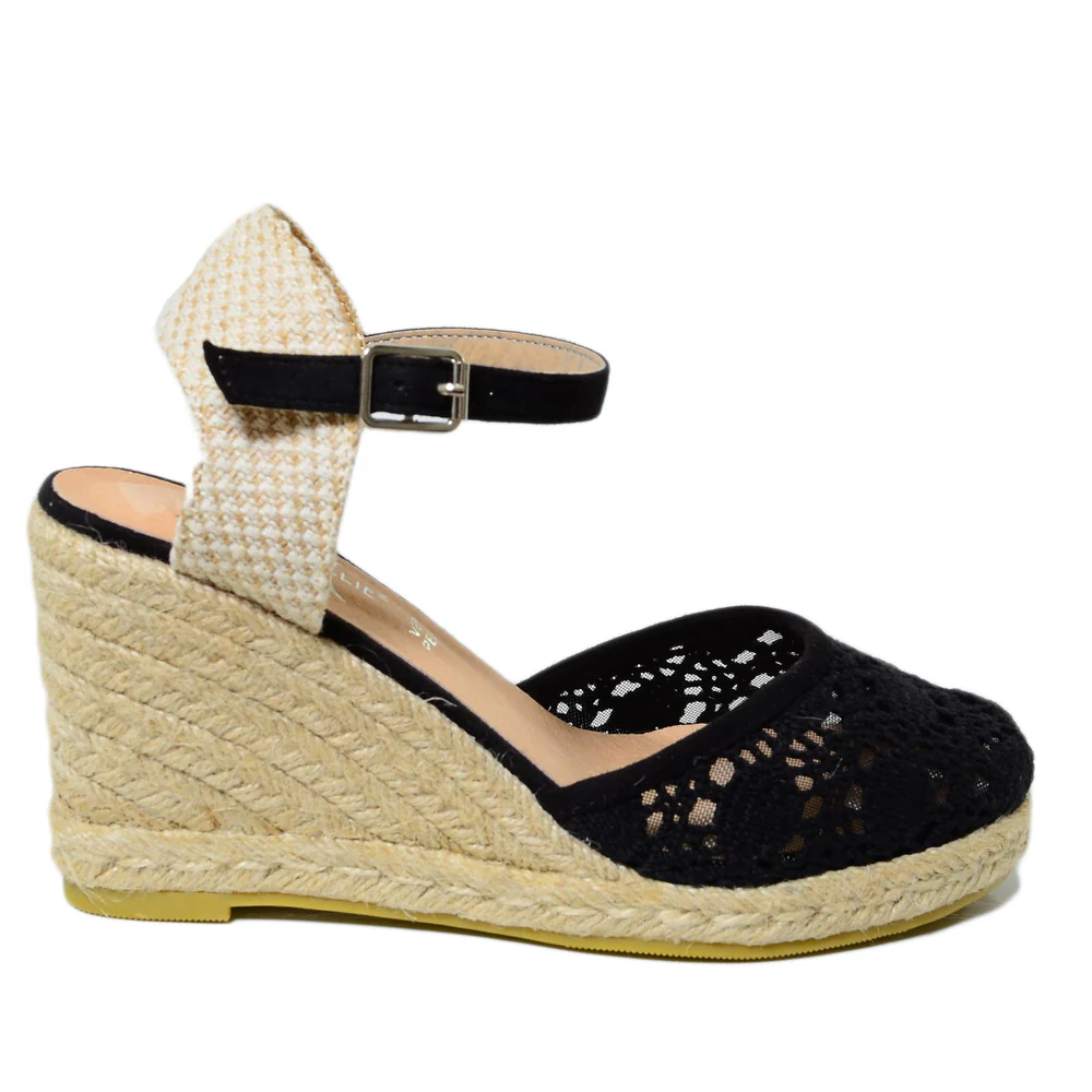 Espadrillas Campesine Nere con Zeppa in Corda in Pizzo
