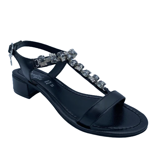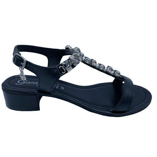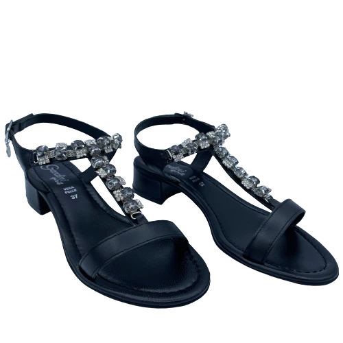 Sandalo in pelle nera con pietre, morbido sottopiede e tacco 4 cm