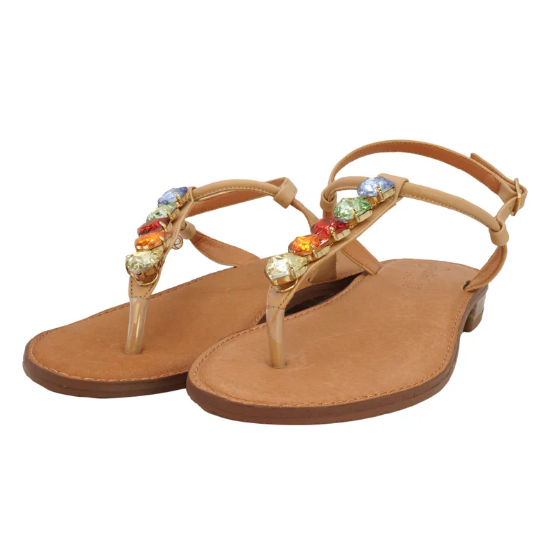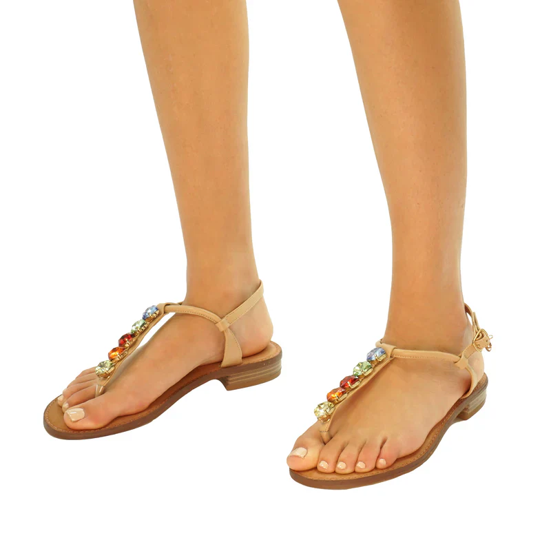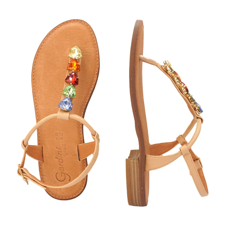 L’estate è fatta di luce, purezza e cieli sempre limpidi. Di questo sono fatti anche i sandali bassi da donna Gwyneth firmati Gardini Spirit. Per la colezione 2024 le scarpe aperte si confermano un punto fermo per le abitudini e le vacanze delle italiane. Quando si guarda questo paio di sandali gioiello la prima cosa che salta all’occhio sono le pietre preziose che adornano la tomaia. Si tratta di pietre multicolor di dimensioni discrete, dal centro degli ornamenti dorati. L’abbinamento cromatico con il beige della scarpa dona una sensazione di freschezza e purezza. I sandali con tacco basso hanno un sottopiede in vera pelle dalla punta arrotondata. Un cinturino regolabile aiuta poi a mantenere il piede in posizione sostenendolo passo dopo passo. Consigliamo la versione color beige di Gwyneth a chi è in cerca di sandali estivi che evocano il mare e la luce. Questi sandali con tacco sono adatti per tutte le occasioni, anche quelle un po’ più formali. I colori si sposano bene con tutto e danno il loro meglio con abiti chiari e sgargianti. Questi sandali da donna possono essere indossati sia con un paio di pantaloni, che con una comoda gonna.