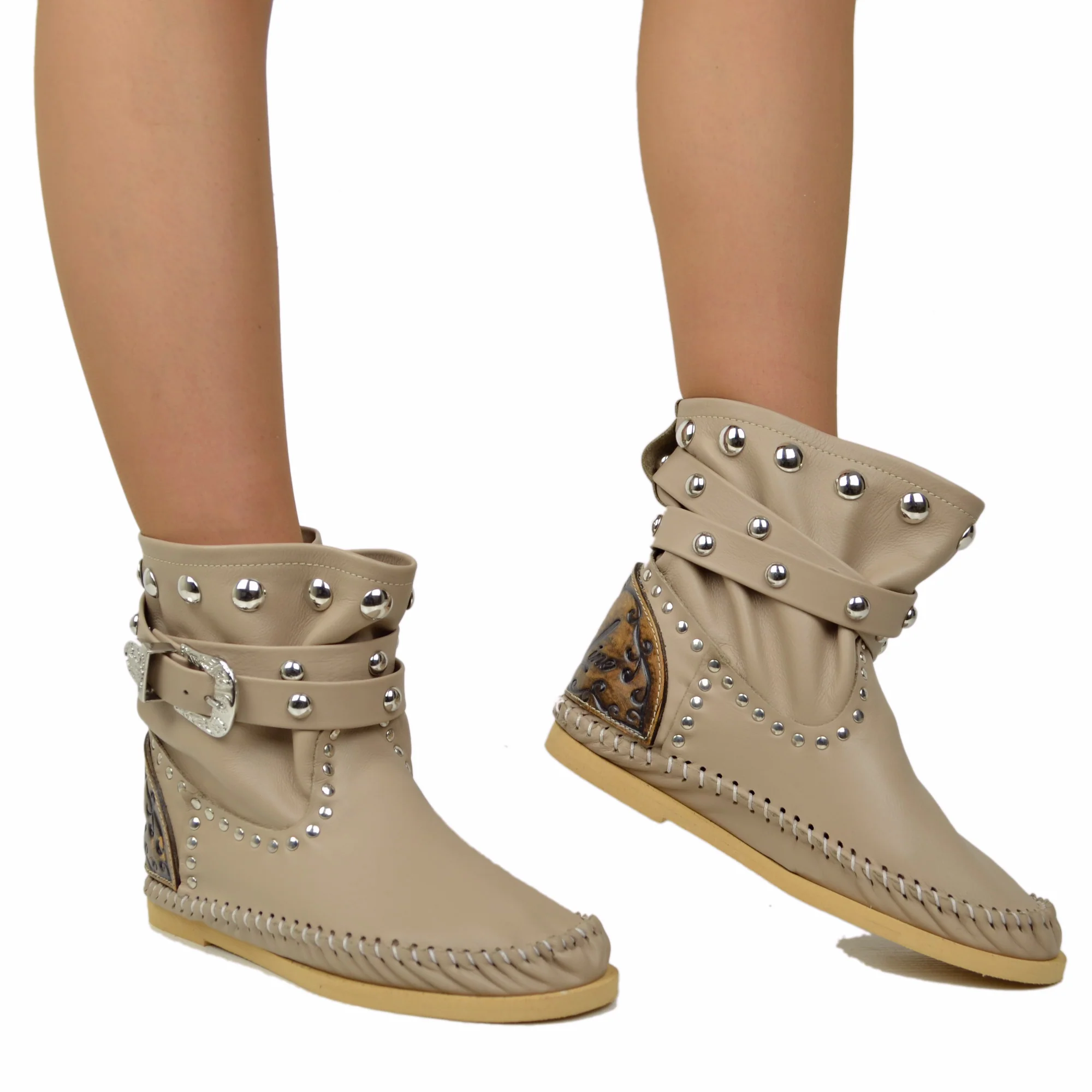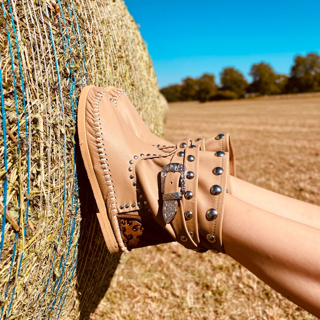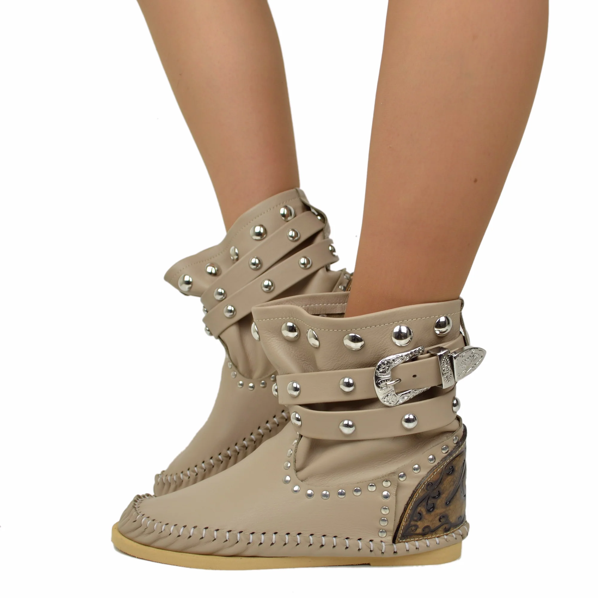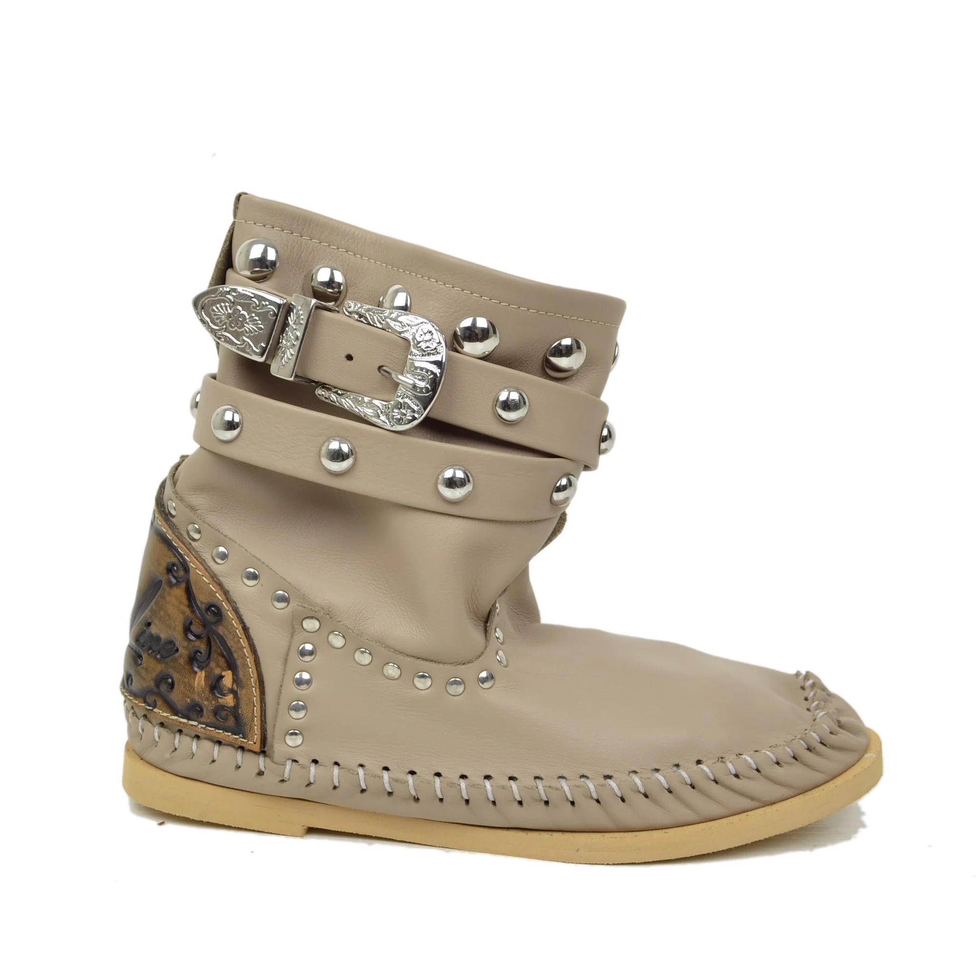 Stivali Indianini Bassi Donna Originali KikkiLine con Zeppa Interna. Indianini Vera Pelle con Borchiette e Due Fibbie. Ibiza Boots Boho con Cuciture su Tono Realizzate a Mano. Indianini Bohemian con Fondo in Micro, Tallonetta in Vero Cuoio. Lavorazione Artigianale Made in Italy.