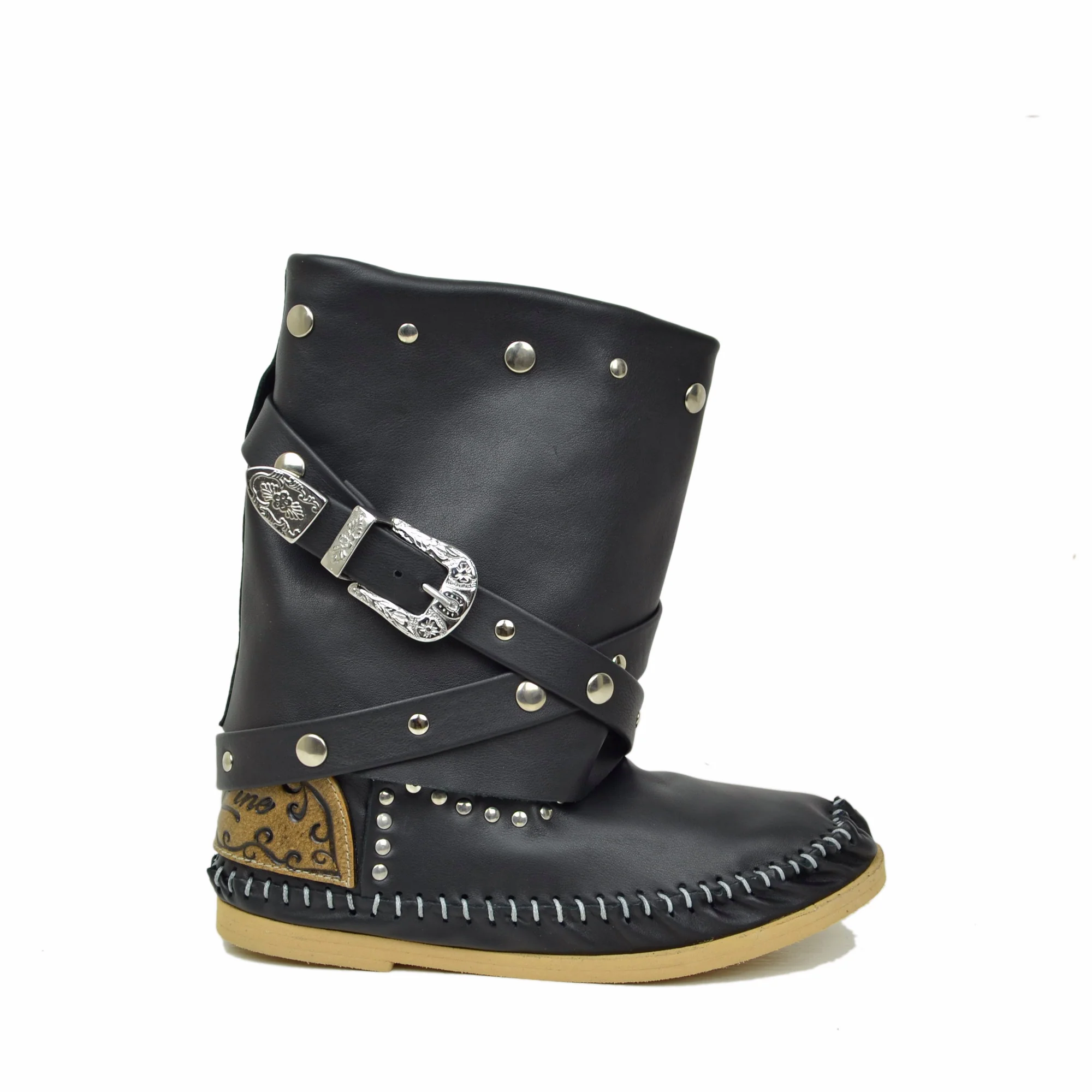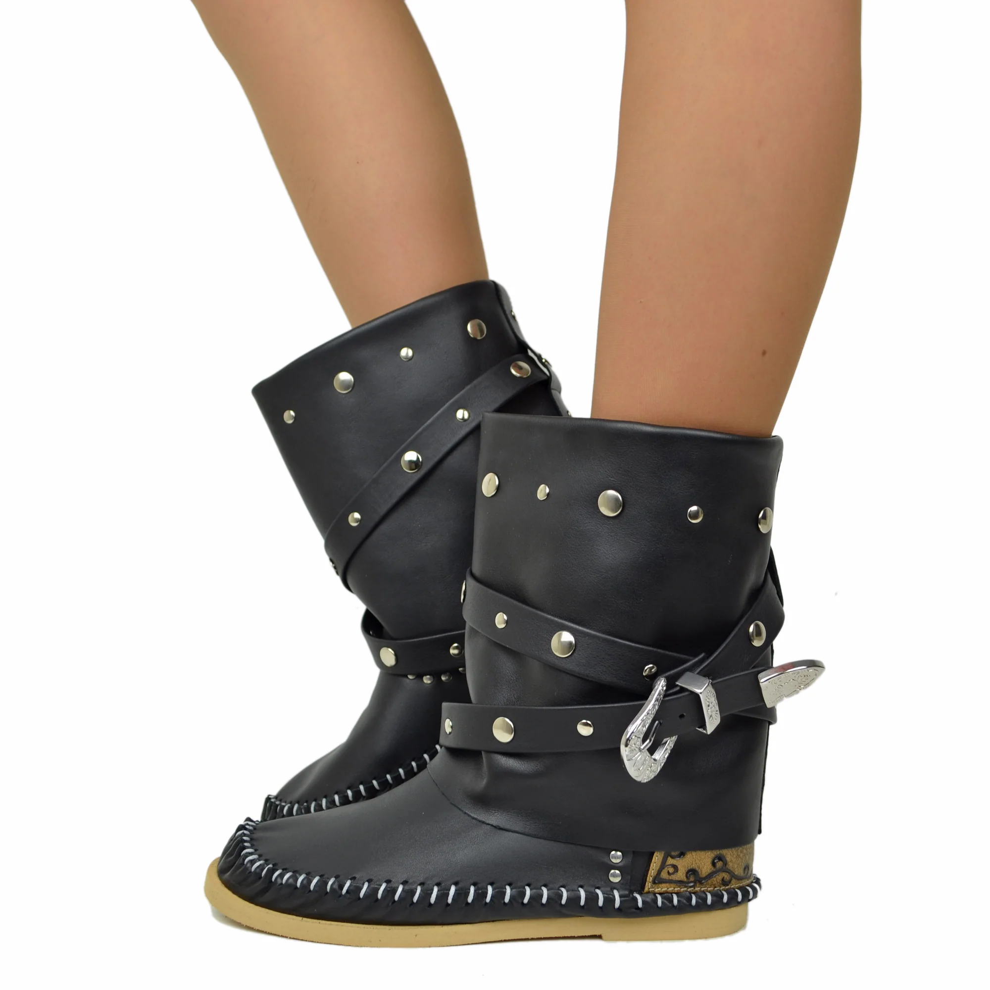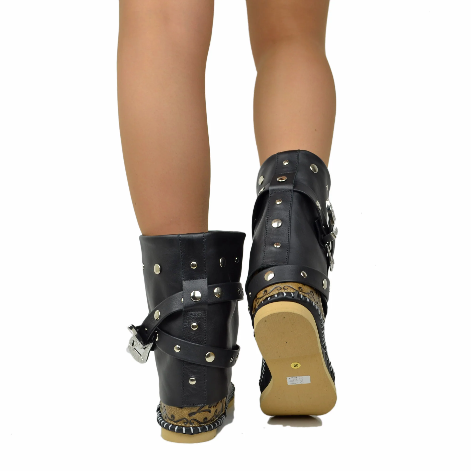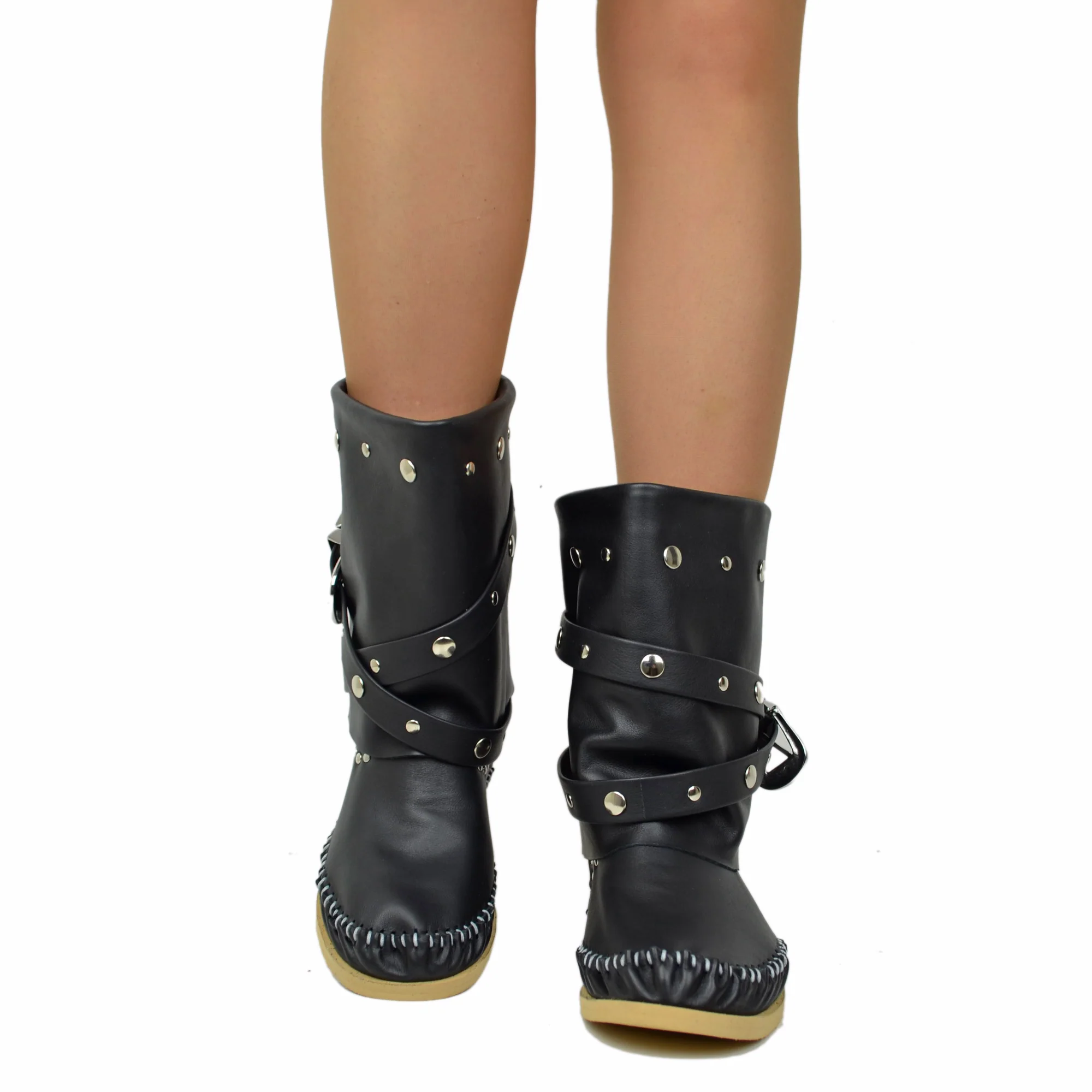Stivali Indianini Bassi con Ghetta Originali KikkiLine con Zeppa Interna. Indianini Vera Pelle con Borchiette e Due Fibbie. Ibiza Boots Boho con Cuciture su Tono Realizzate a Mano. Indianini Bohemian con Fondo in Micro, Tallonetta in Vero Cuoio. Lavorazione Artigianale Made in Italy.