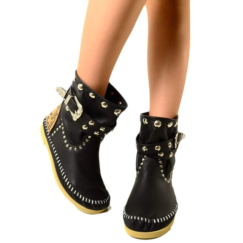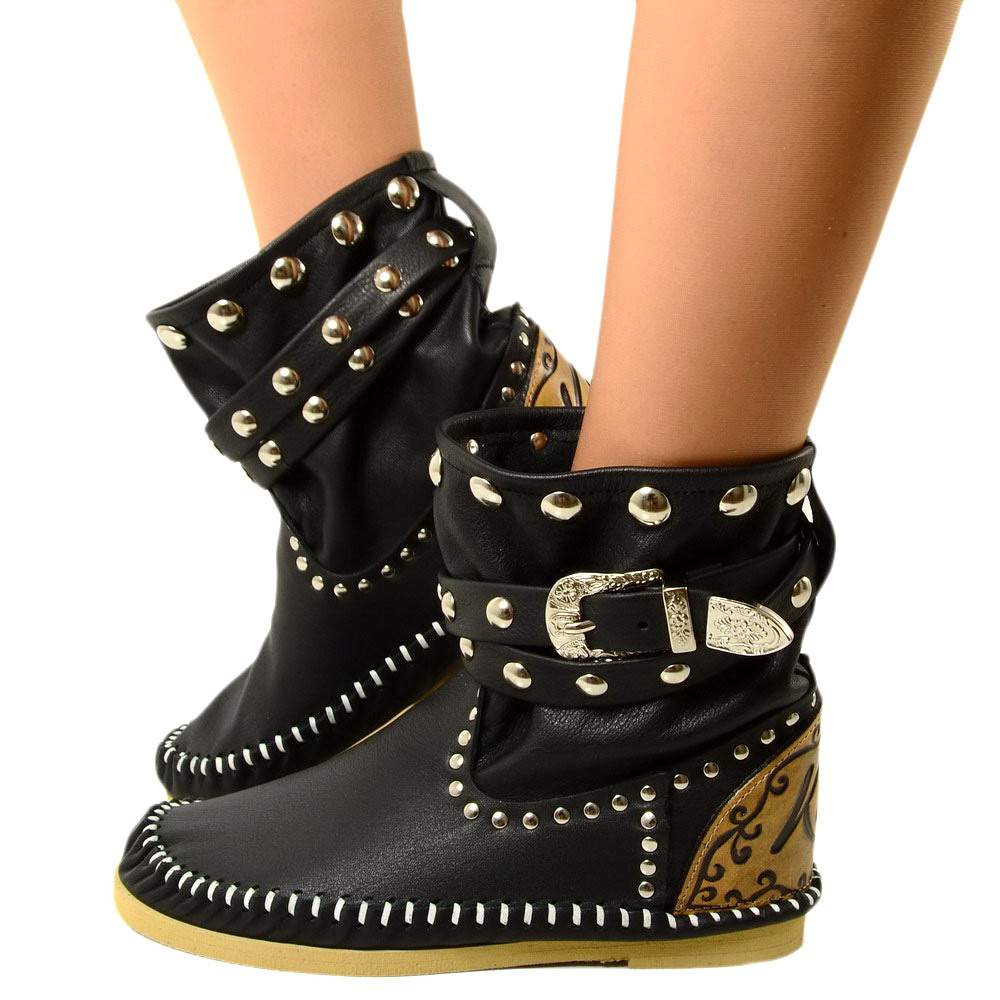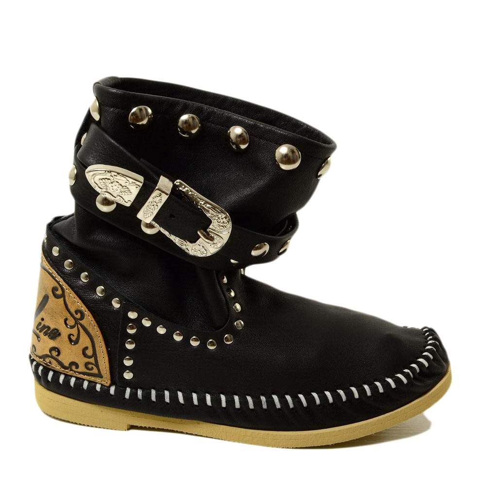 Stivali Indianini Bassi Donna Originali KikkiLine con Zeppa Interna. Indianini Vera Pelle con Borchiette e Due Fibbie. Ibiza Boots Boho con Cuciture su Tono Realizzate a Mano. Indianini Bohemian con Fondo in Micro, Tallonetta in Vero Cuoio. Lavorazione Artigianale Made in Italy.