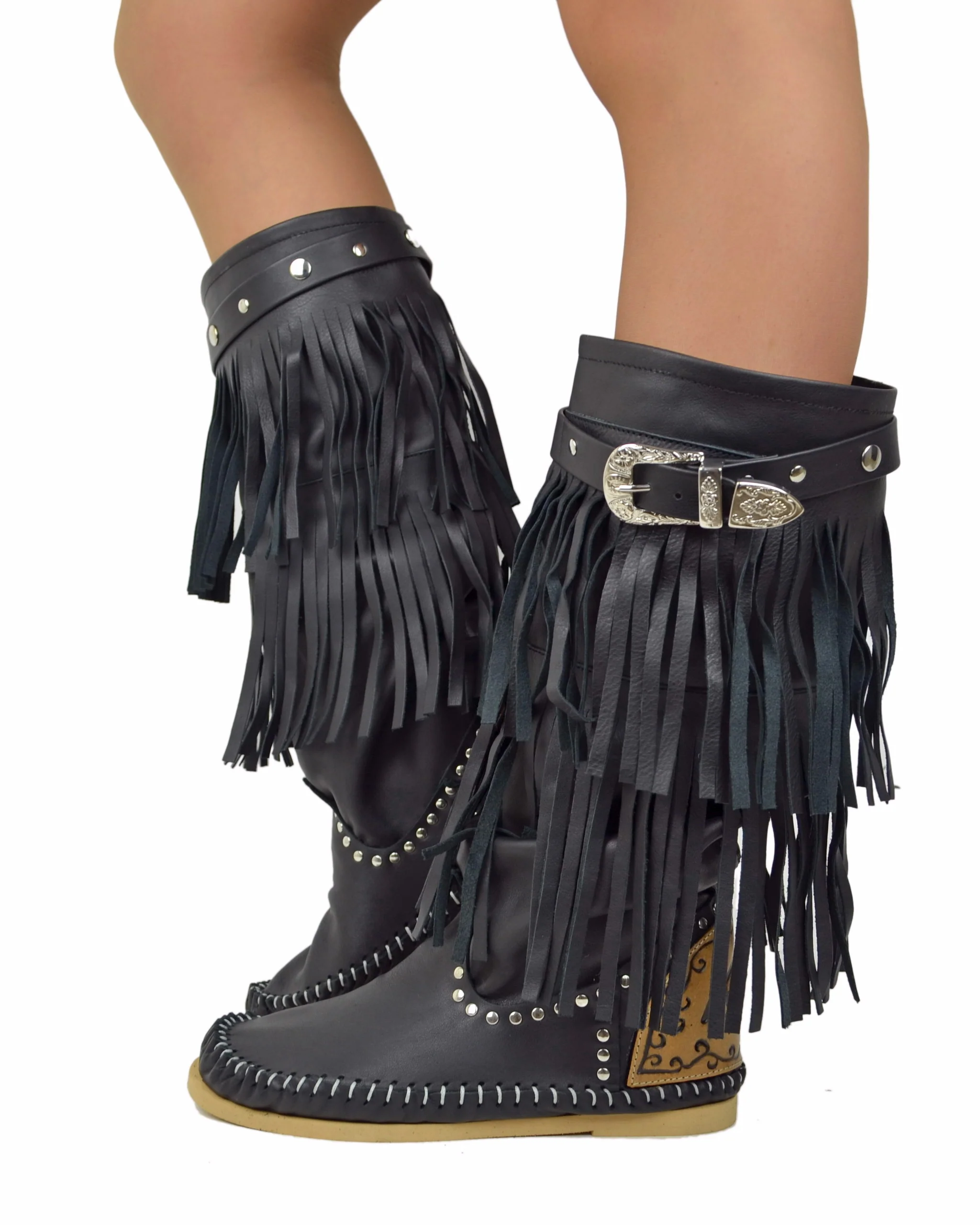 Indianini con Frange Vera Pelle Neri Fibbia Laterale Firmati KikkiLine Tallonetta Cuoio