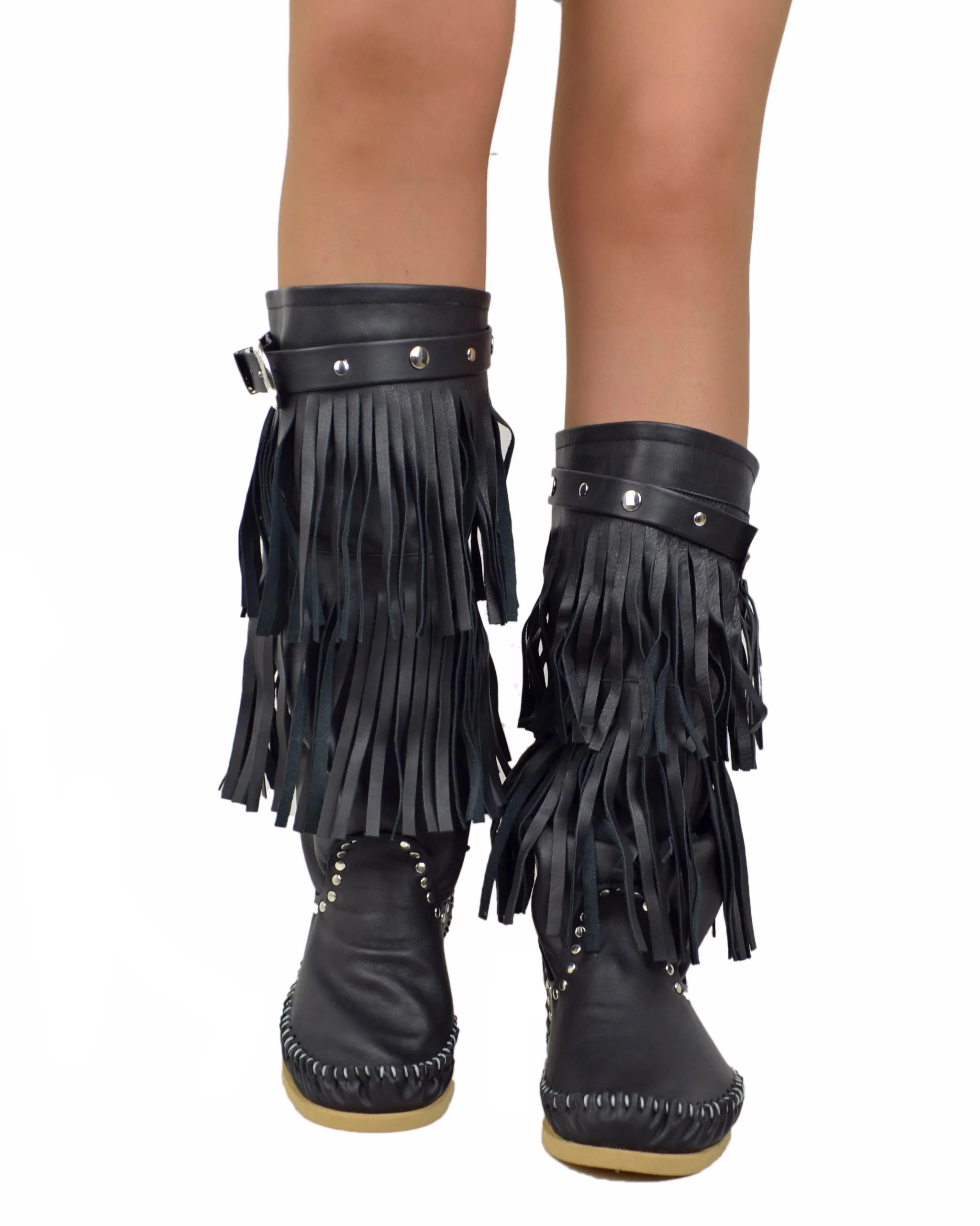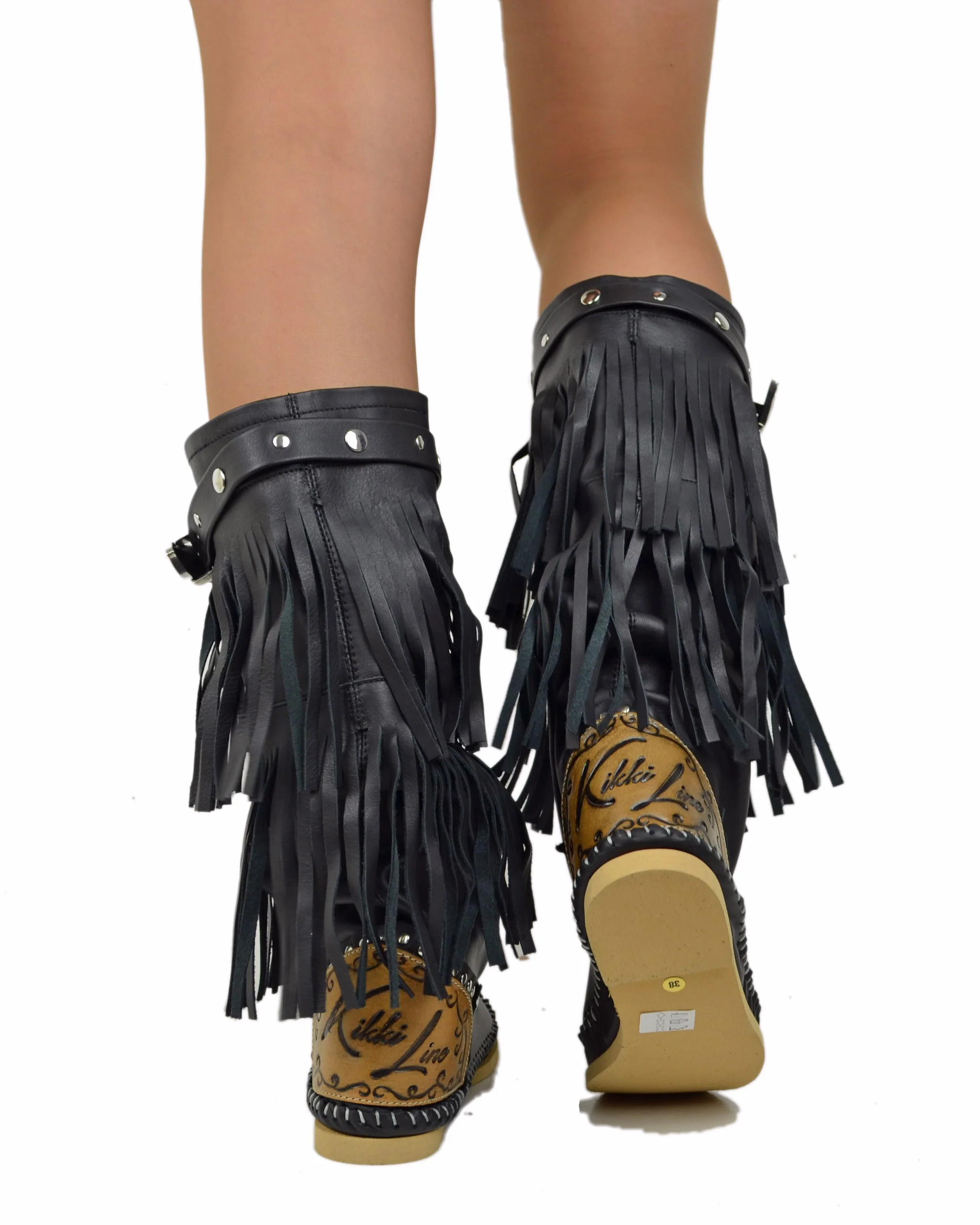 Vesti i tuoi piedi con gli indianini firmati KikkiLine. Realizzati a Riccione in vera pelle nera, con frange e fibbia laterale. La tallonetta in cuoio garantisce unicitร e la zeppetta interna un comfort duraturo. Aggiungi uno stile unico al tuo look con questi indianini originali Kikkiline!