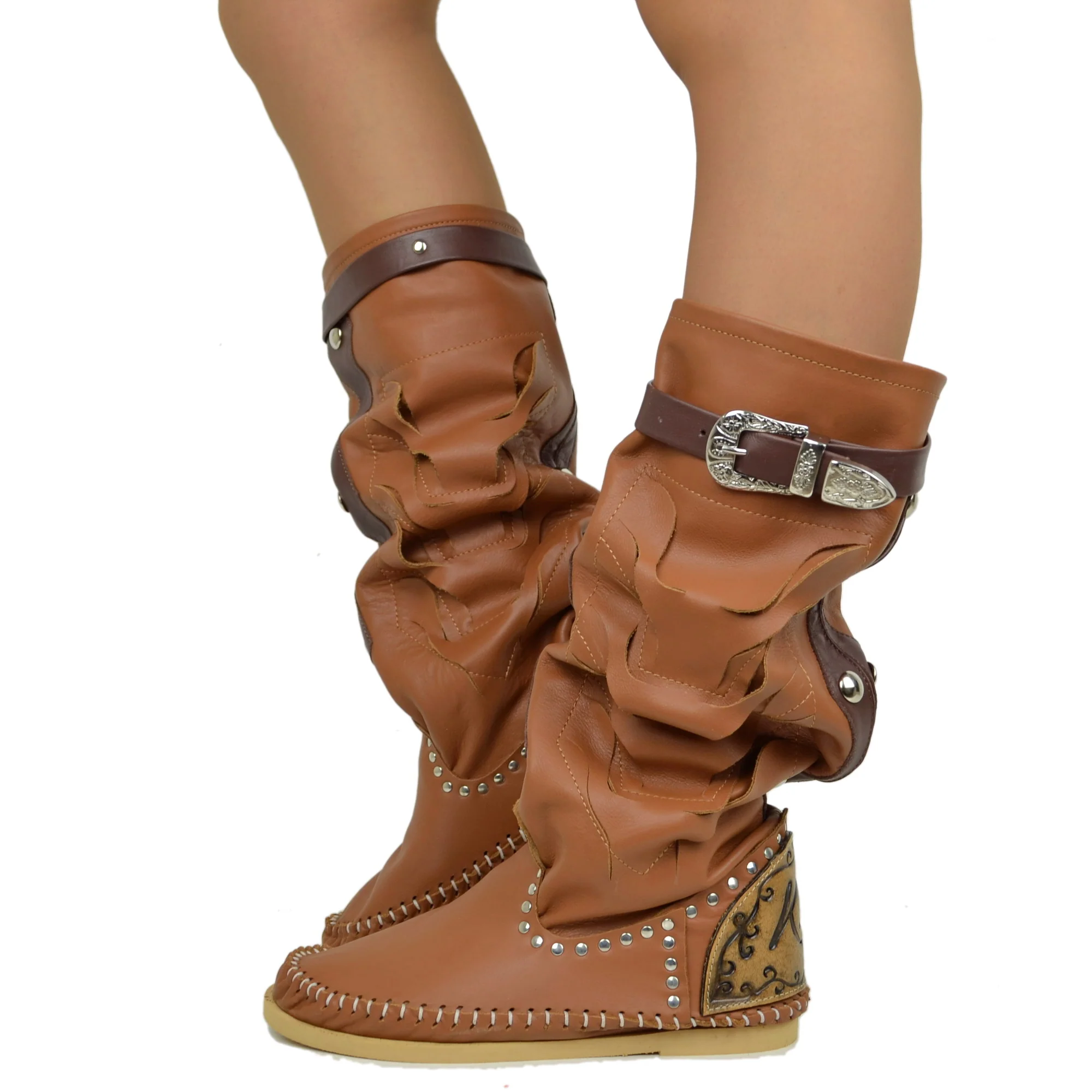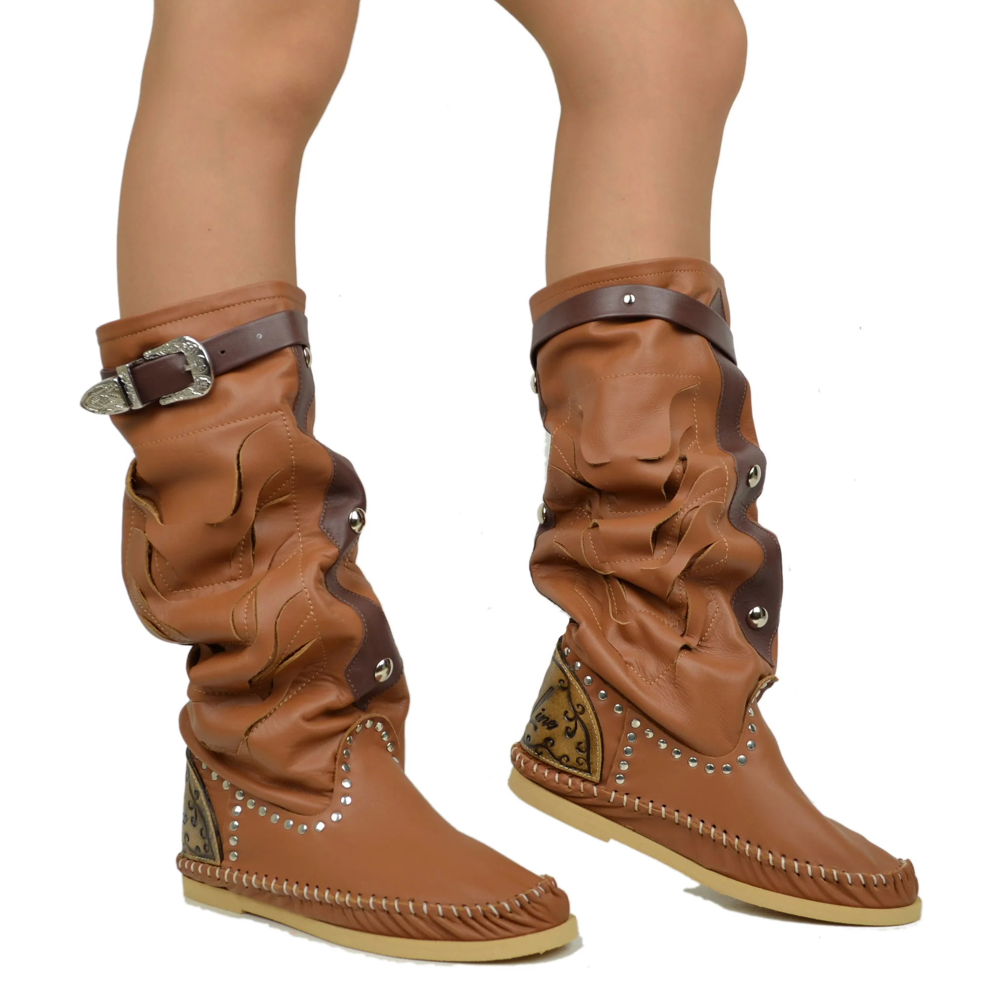 Stivali Indianini Donna Originali KikkiLine con Zeppa Interna. Vera Pelle con Intagli Borchiati e Cinturino al Polpaccio. Indianini Ibiza con Cuciture su Tono Realizzate a Mano. Fondo in Micro, Tallonetta in Vero Cuoio, Pelle Naturale Soft Morbidissimi. Stivali Boho Chic, Lavorazione Artigianale Made in Italy.