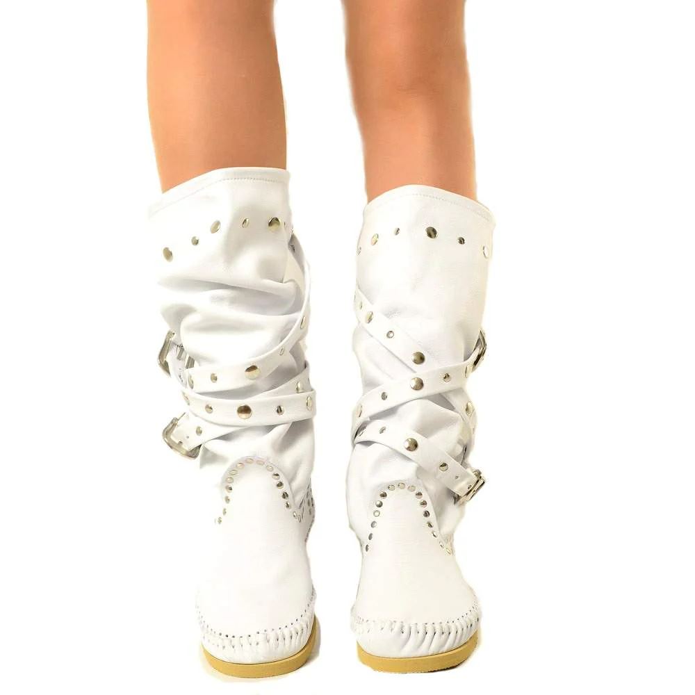 Stivali Indianini Donna Originali KikkiLine con Zeppa Interna. Indianini Vera Pelle con Borchiette e Due Fibbie. Ibiza Boots Boho con Cuciture su Tono Realizzate a Mano. Indianini Bohemian con Fondo in Micro, Tallonetta in Vero Cuoio. Lavorazione Artigianale Made in Italy.