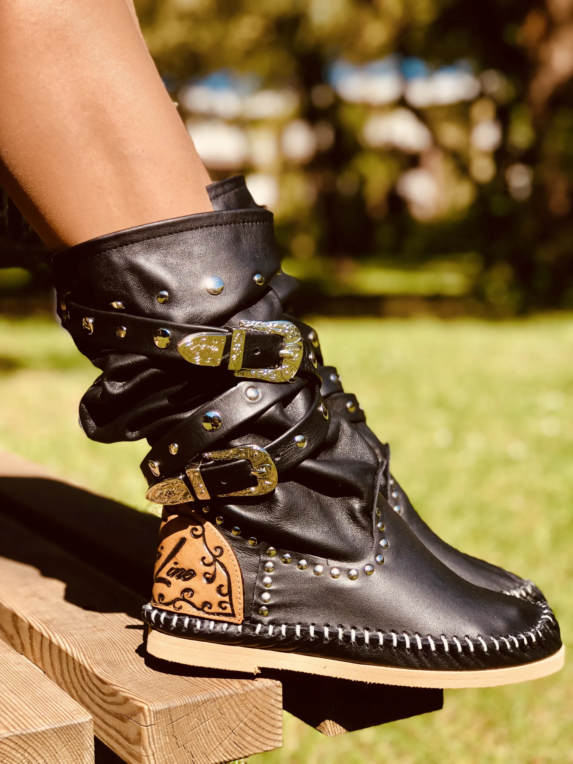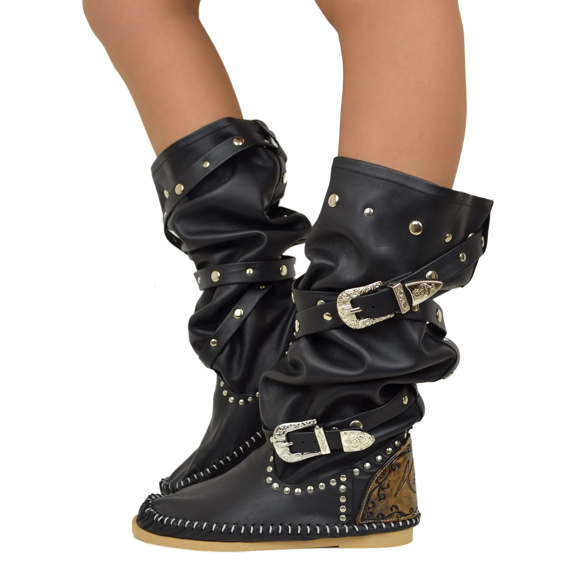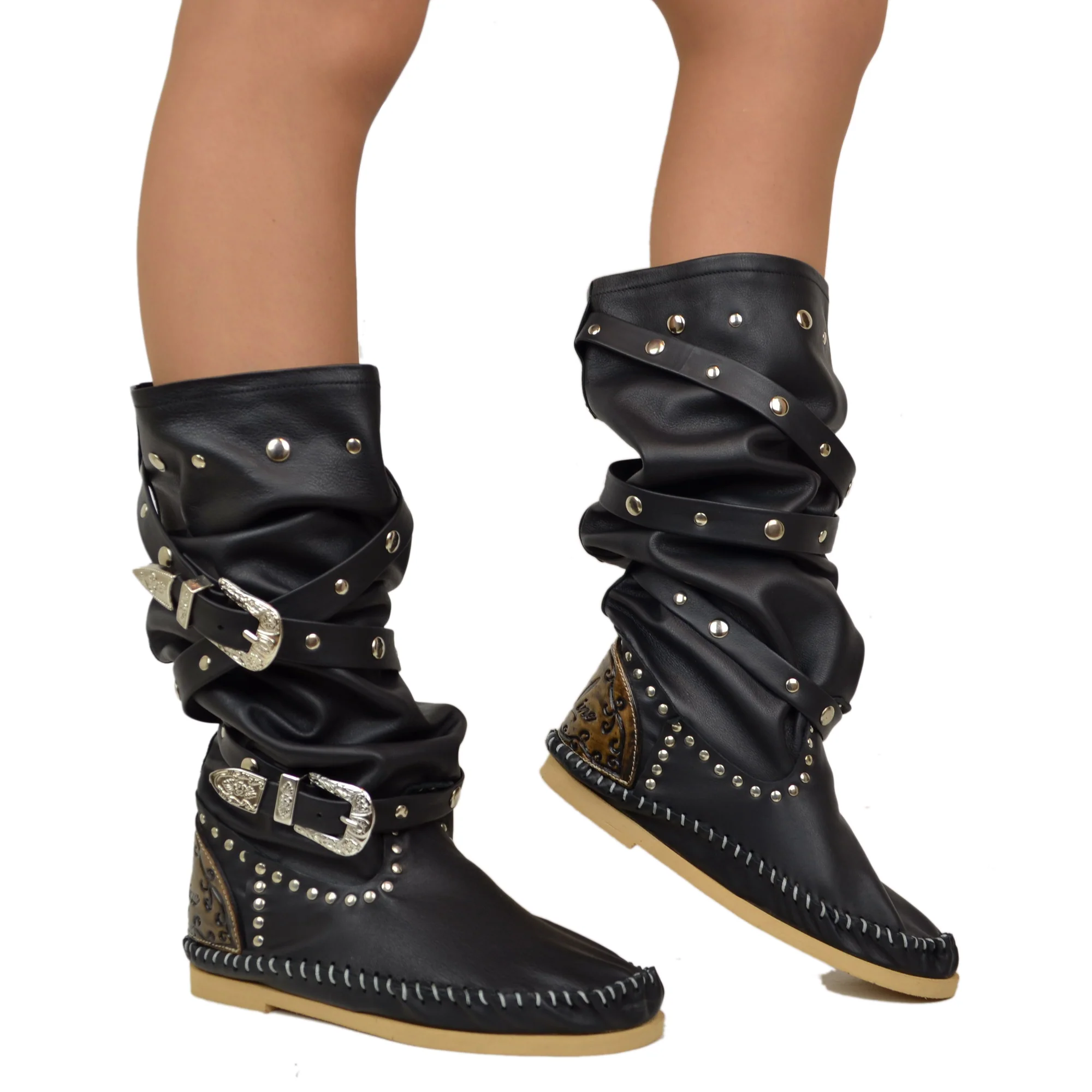Stivali Indianini Donna Originali KikkiLine con Zeppa Interna. Indianini Vera Pelle con Borchiette e Due Fibbie. Ibiza Boots Boho con Cuciture su Tono Realizzate a Mano. Indianini Bohemian con Fondo in Micro, Tallonetta in Vero Cuoio. Lavorazione Artigianale Made in Italy.