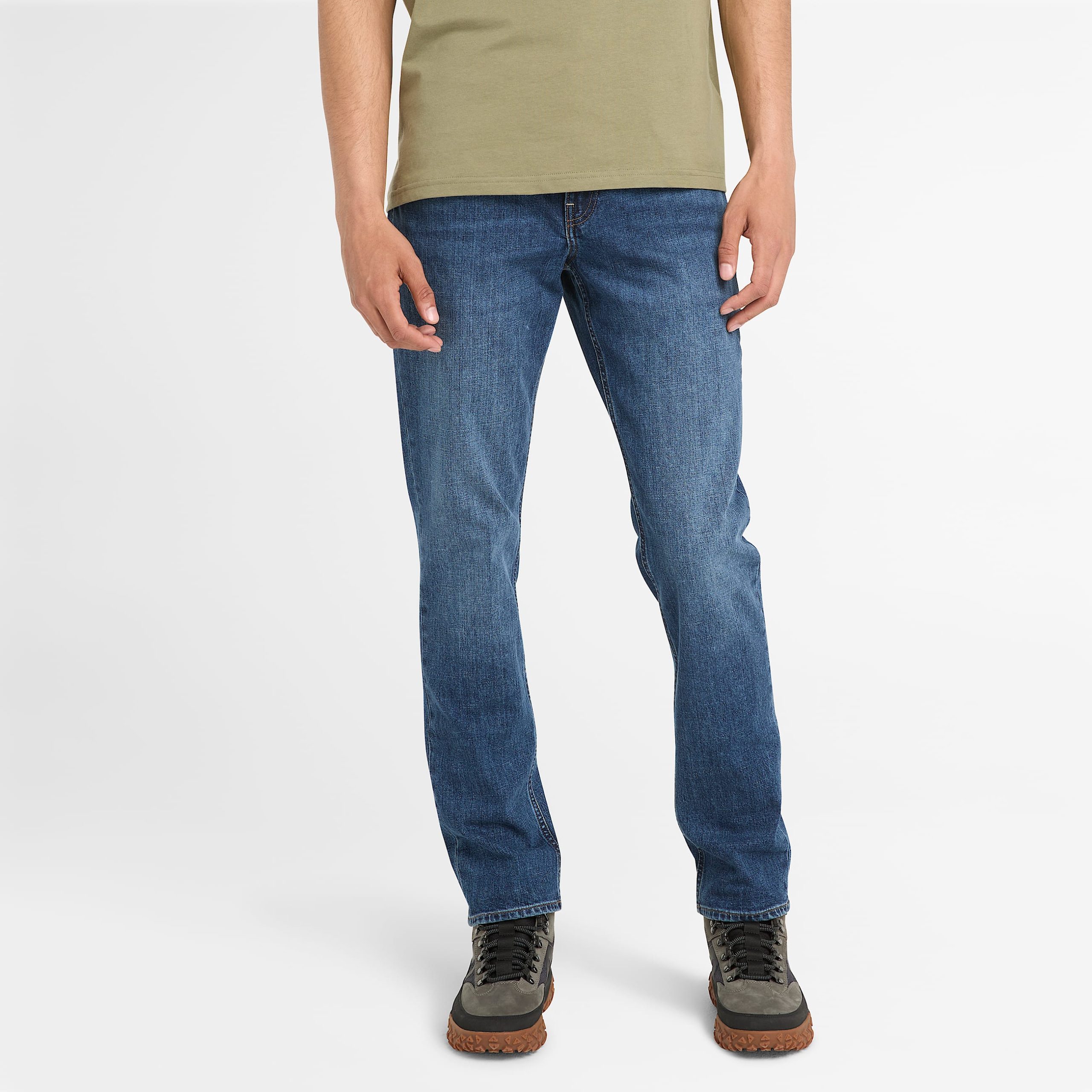 Jeans sandown 5 pocket slim denim mid indigo Questi comodi jeans slim elasticizzati, realizzati in 98% cotone biologico nel tradizionale design a cinque tasche, sono un classico dallo stile moderno.