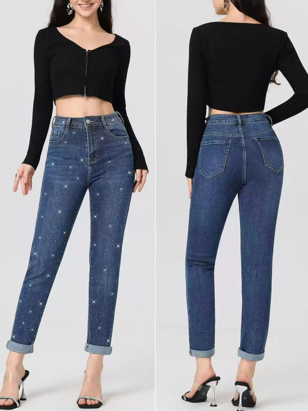 - Rinnova il tuo guardaroba con questi jeans boyfriend fit decorati con strass sul davanti. Un capo unico e raffinato che ti farà risplendere con stile e carattere in ogni situazione.