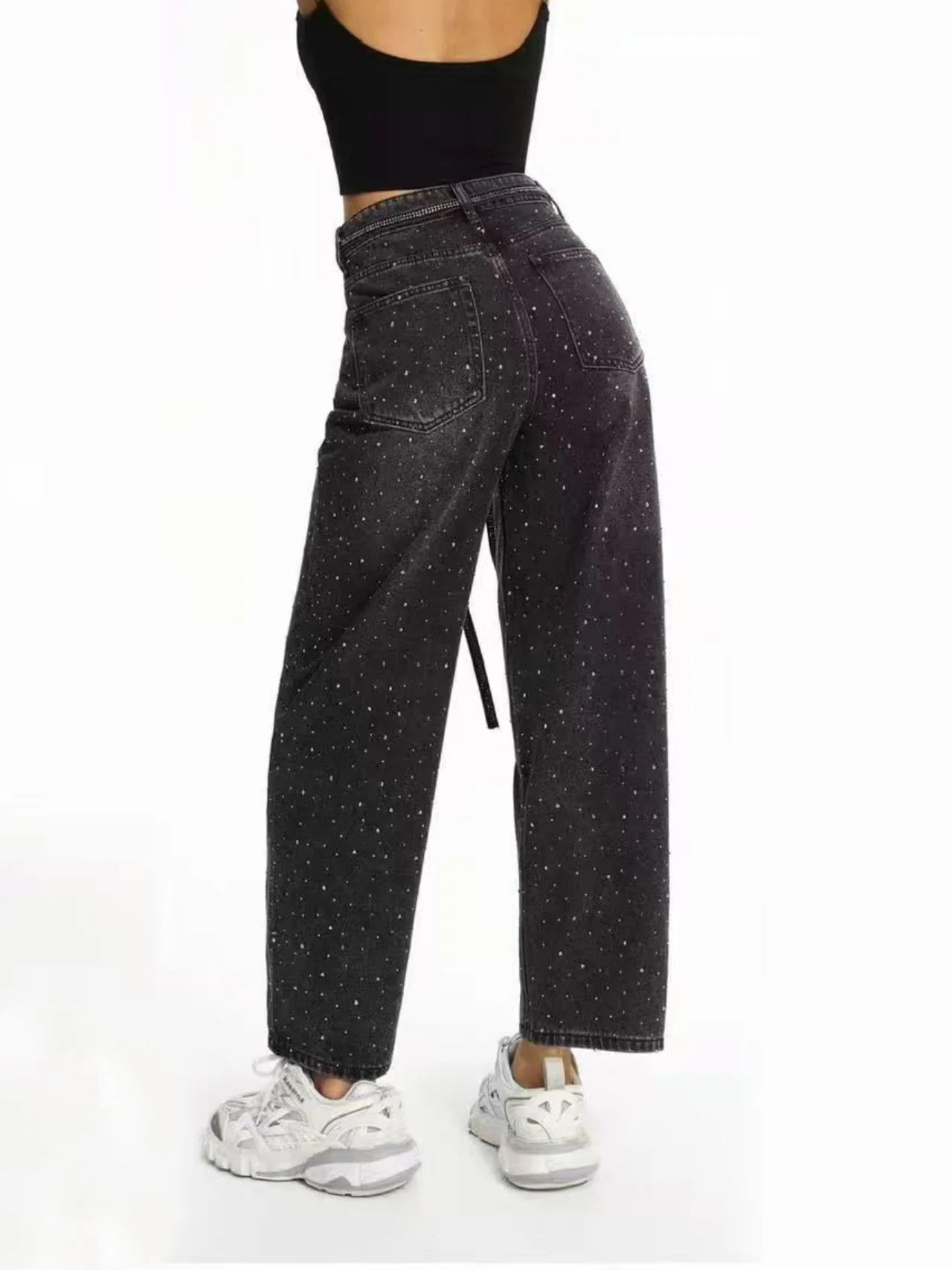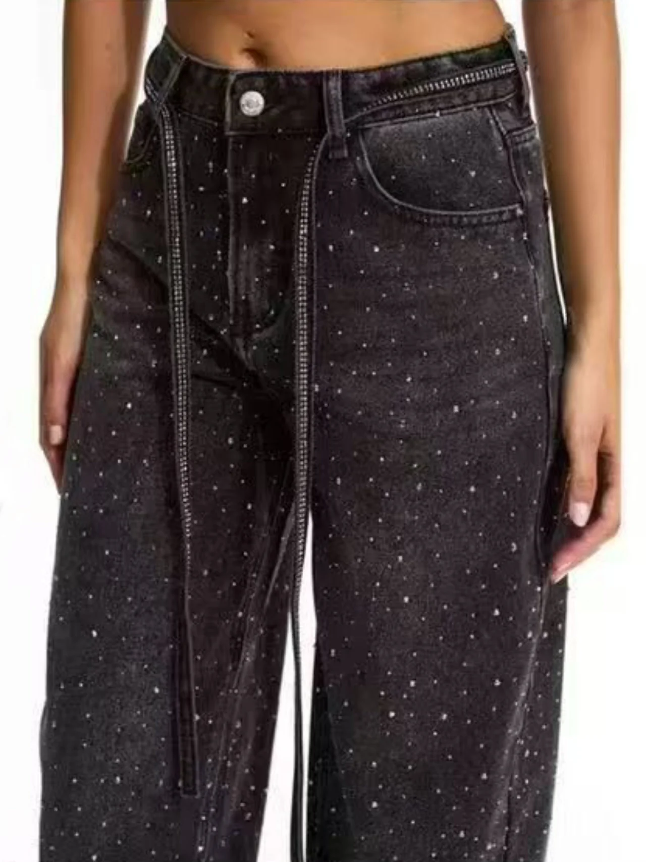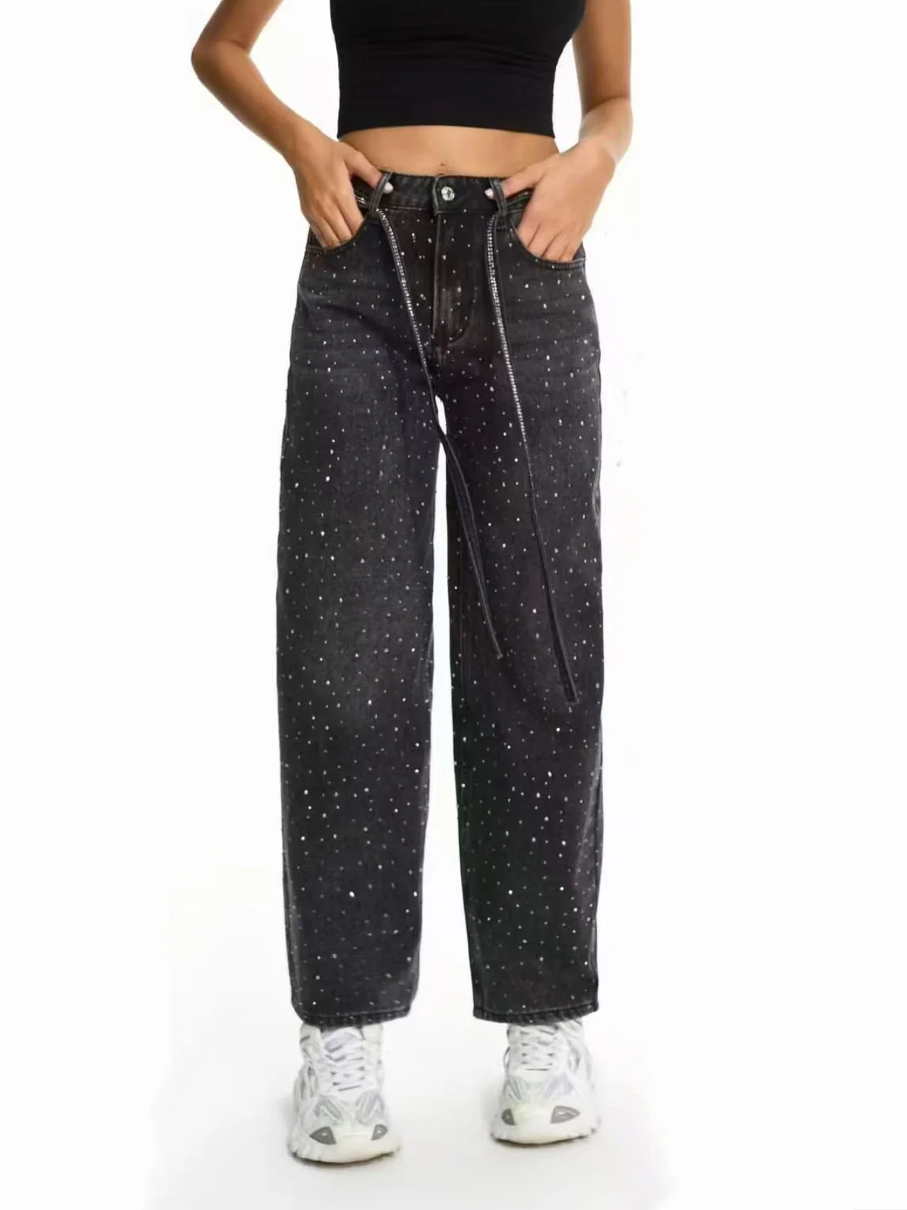 - Dai un tocco fresco al tuo guardaroba con questi jeans mom fit dotati di cinturino e decorati con strass scintillanti! Un capo alla moda e luminoso, perfetto per distinguerti con classe e carattere in ogni occasione.