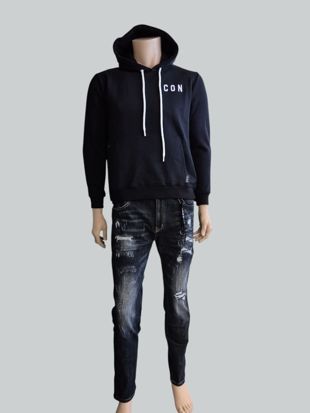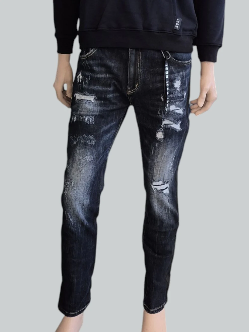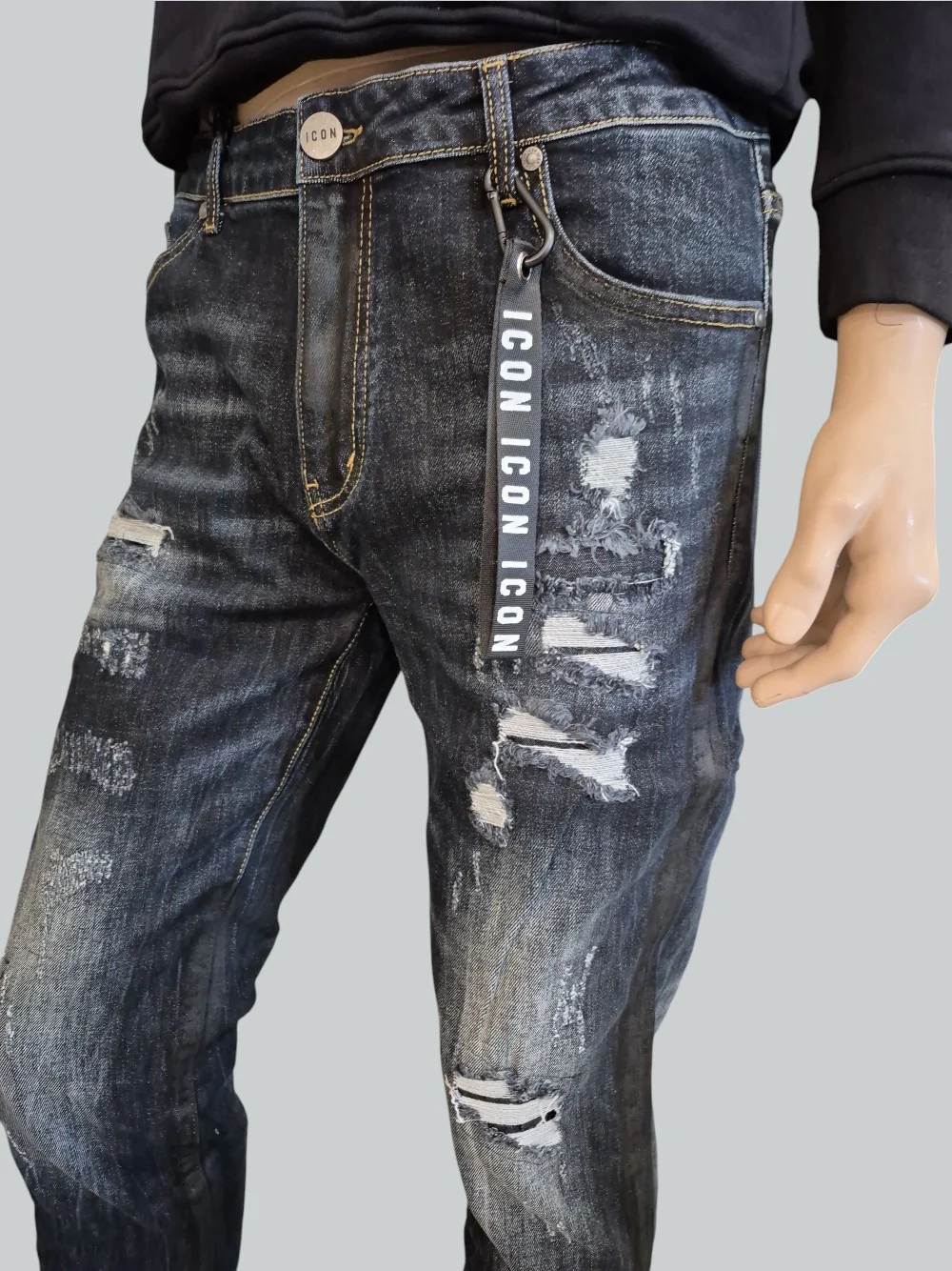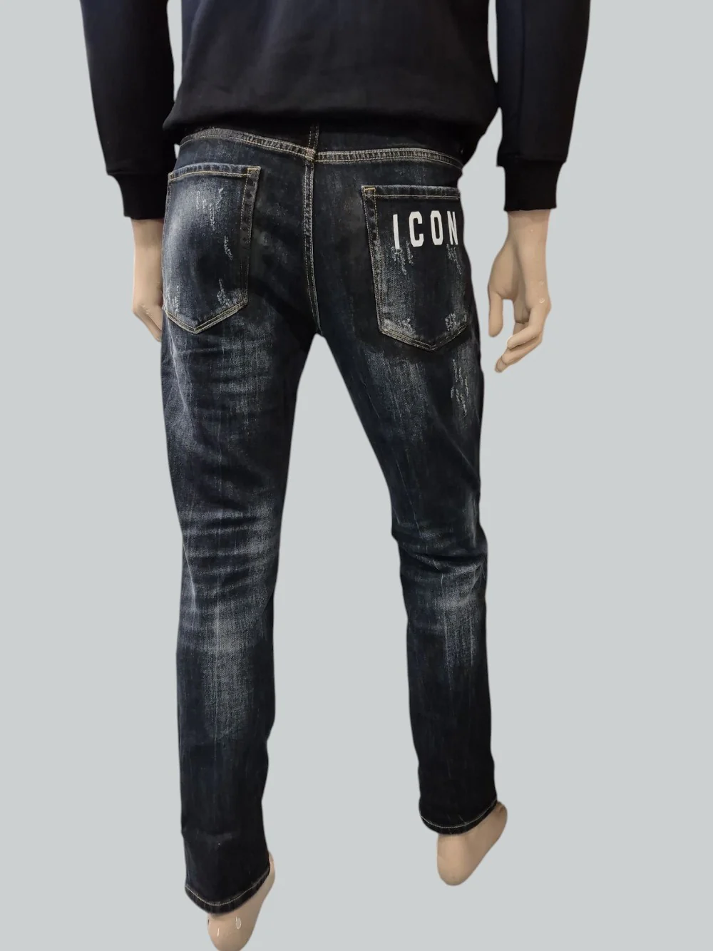 Il lavaggio dark blu con dettagli scoloriti e smerigliati dona profondità e un effetto vissuto sofisticato, esaltando il fascino autentico del denim. Il design è completato dal logo ICON discreto e distintivo, simbolo di stile contemporaneo.