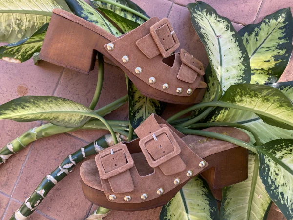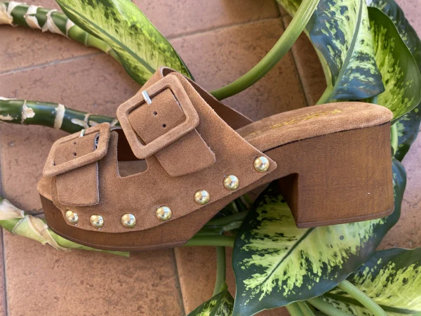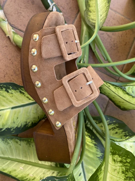 Sandalo doppia fascia con fibbie in pelle scamosciata cuoio
