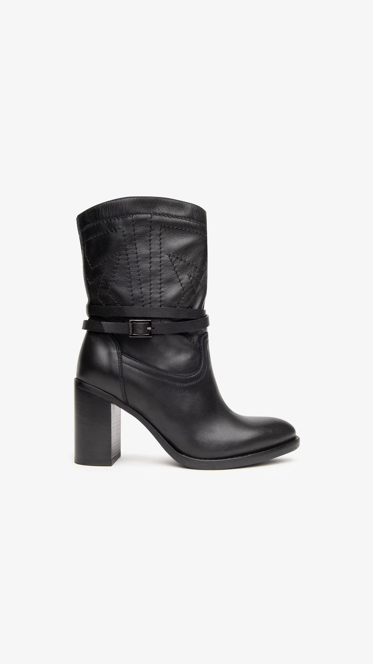 Stivaletti stile texano in pelle con cuciture a tema stelle. Cinturini incrociati in pelle e tacco di 8,5 cm per un look grintoso e di tendenza.