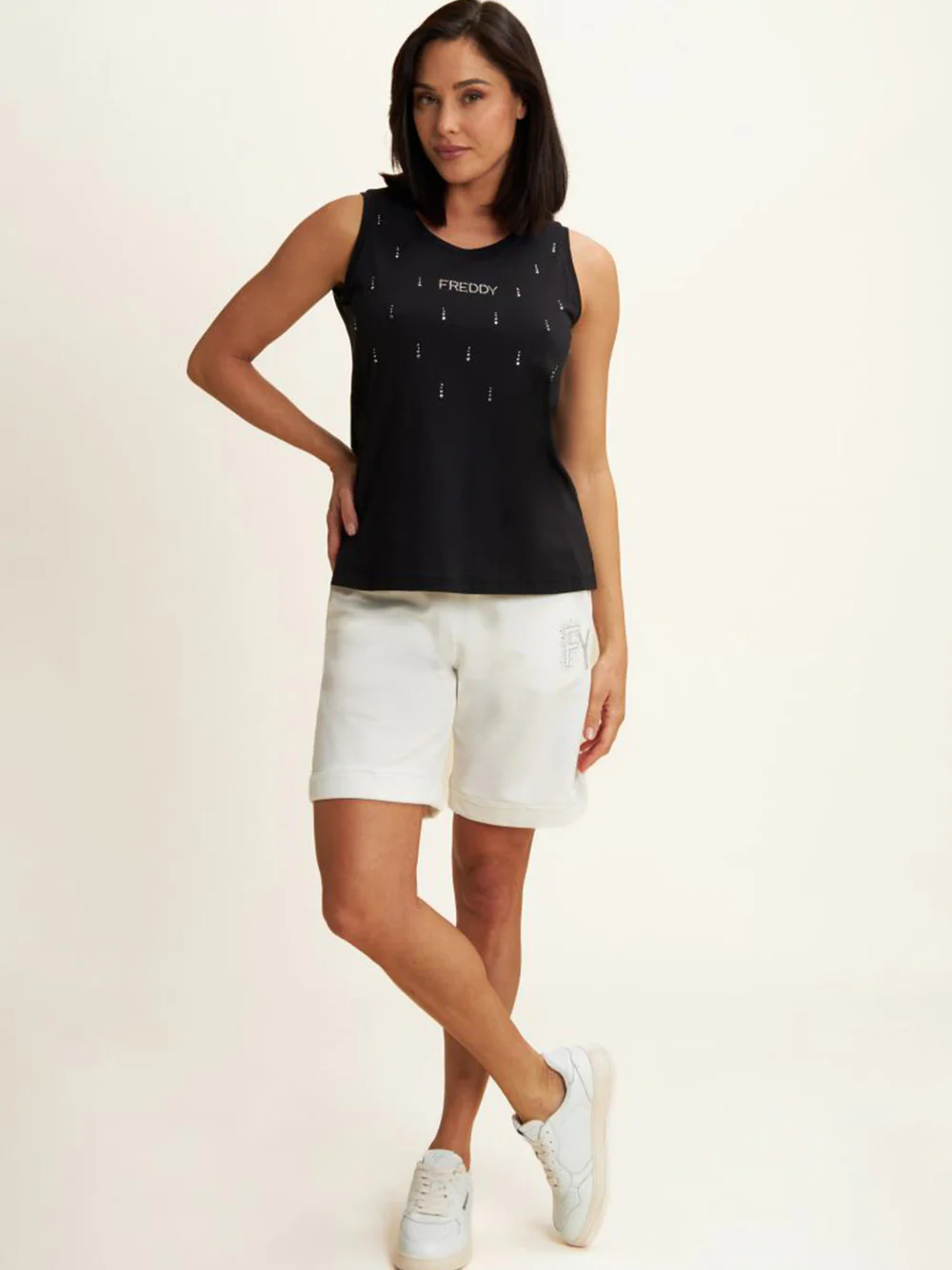 I pantaloncini Freddy in French Terry Modal sono la scelta ideale per un look sportivo e fresco, perfetto per ogni occasione casual. Il tessuto leggero e morbido al tatto garantisce una sensazione di comfort assoluto, mentre la vita regular in costina con coulisse assicura una vestibilità regolabile e sempre perfetta. Il design bermuda con risvolto sul fondo dona un tocco moderno e versatile. I dettagli in strass, aggiungono una nota di stile raffinata, mentre le tasche laterali completano il capo con praticità. Perfetti da abbinare a t-shirt e sneakers per un outfit sporty-chic impeccabile.