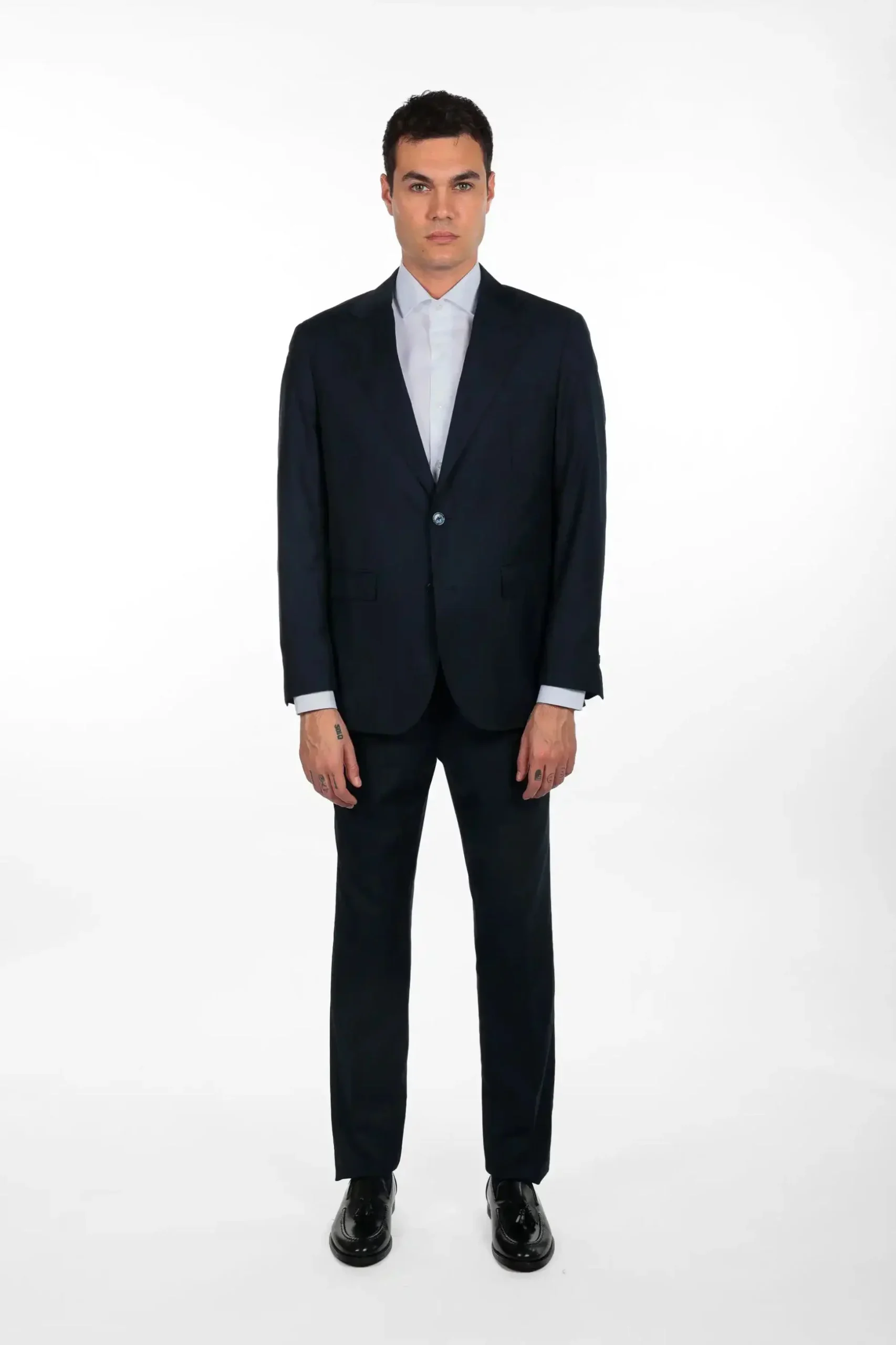 Pantalone classico da abito, gamba dritta, tasche laterali e posteriori, elegante e raffinato. Il modello è alto 1,80 e indossa la taglia 48.