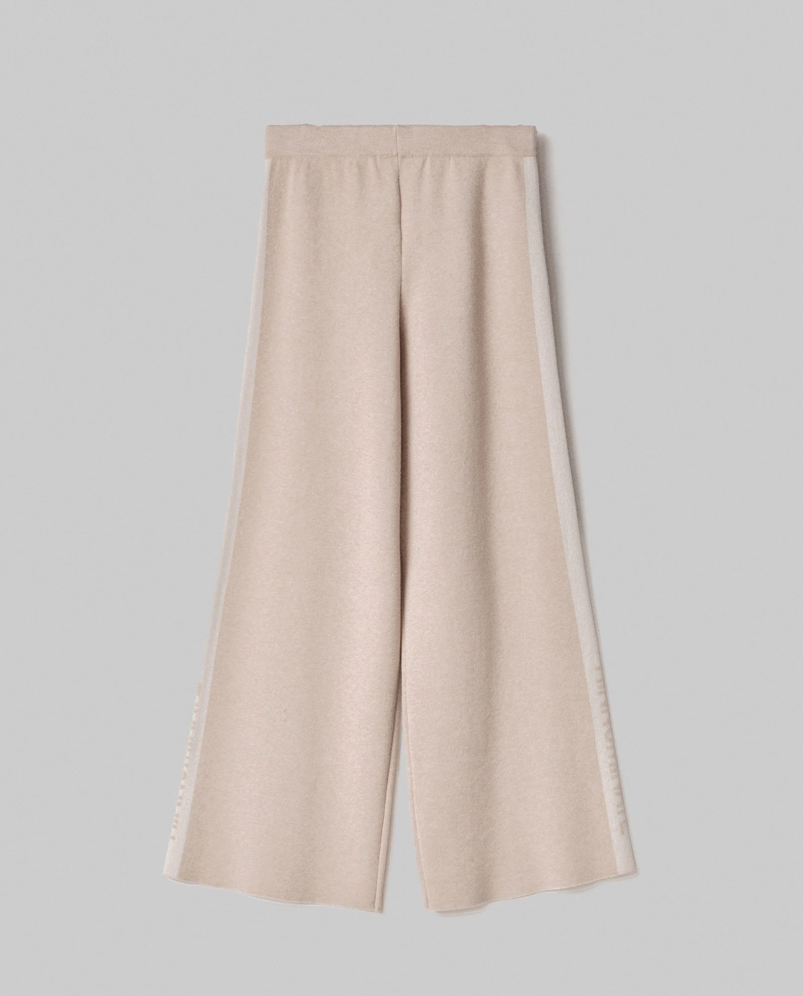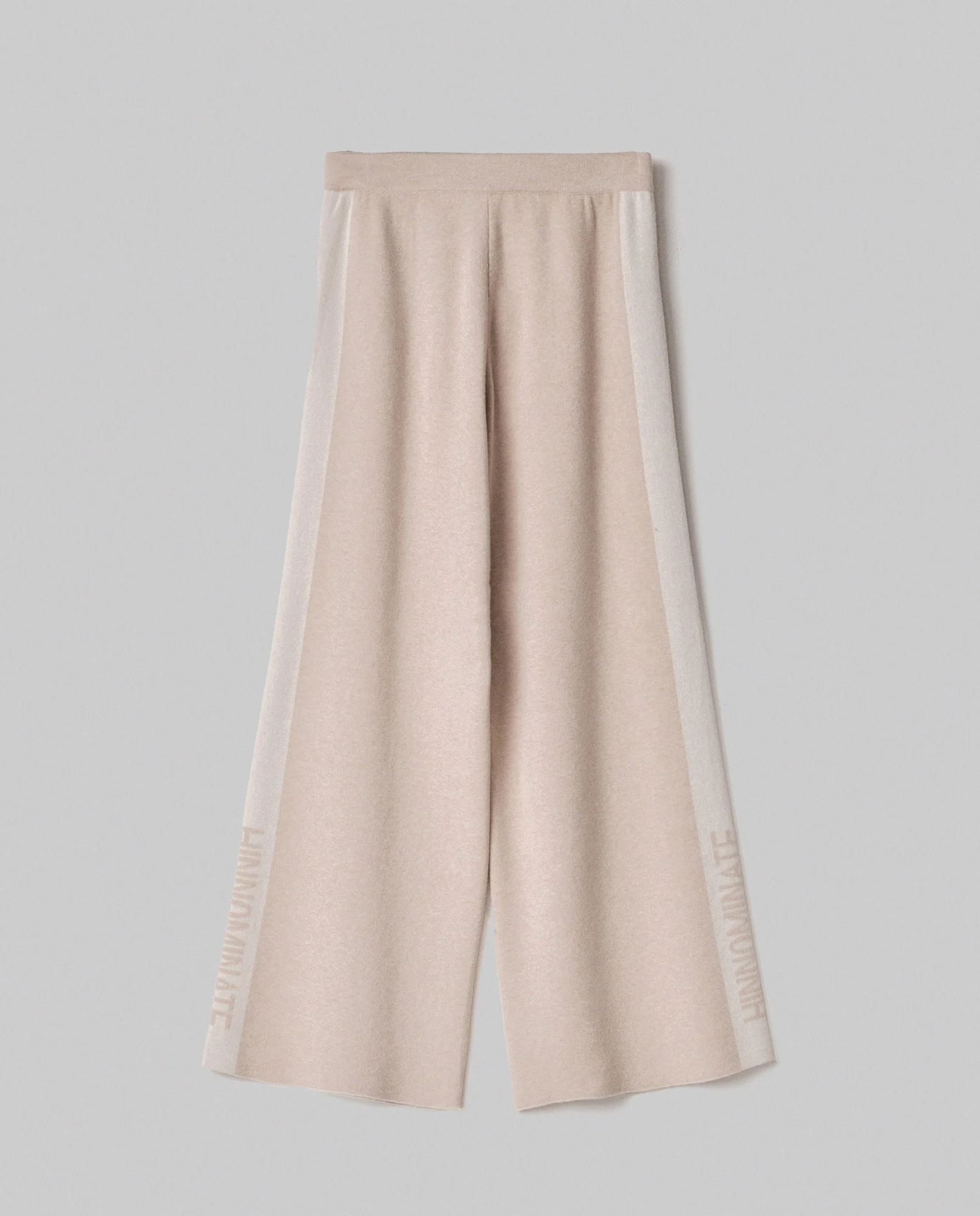 Pantalone in maglia a palazzo con logo in punto rovescio beige- HINNOMINATE, dal taglio elegante. Perfetta per uno stile casual e comodo.
